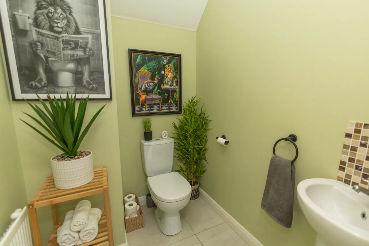 Downstairs WC with tiled flooring, white suite including WC and wash hand basin with tiled splashback, and a single radiator.