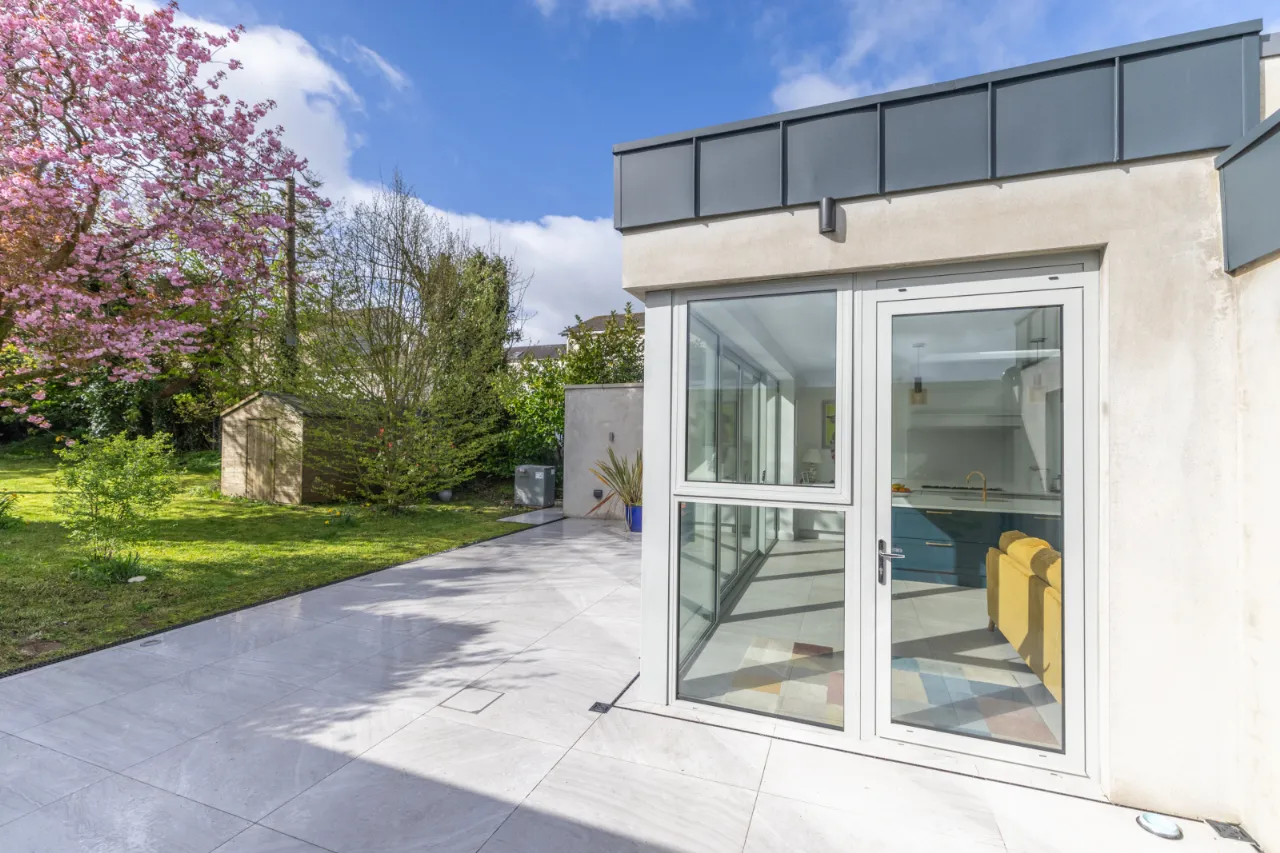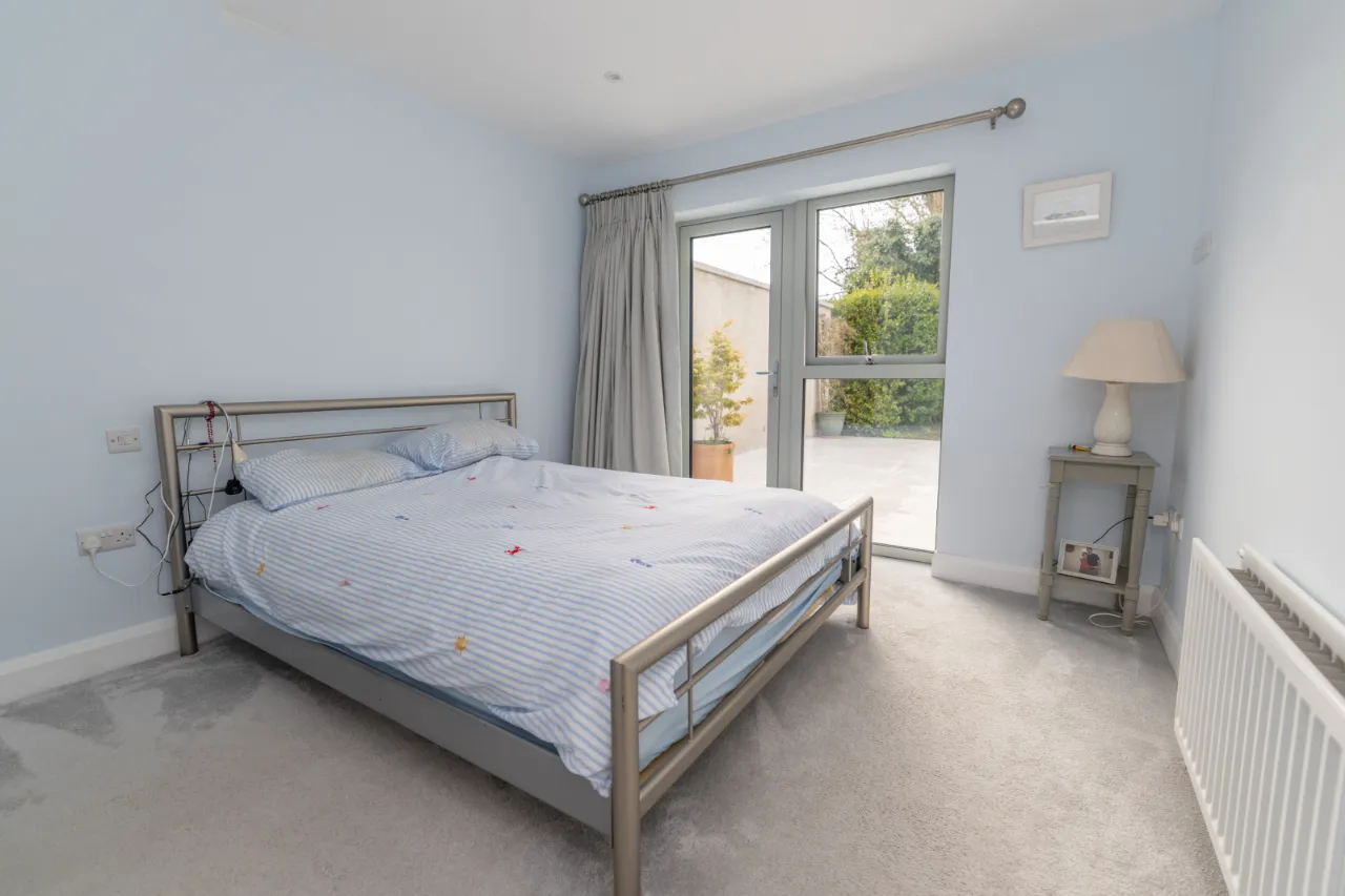 The living area offers a comfortable and contemporary setting, complete with an electric remote-control fire, TV point, and excellent natural light. Patio doors lead directly to the rear garden, creating a seamless indoor-outdoor flow.