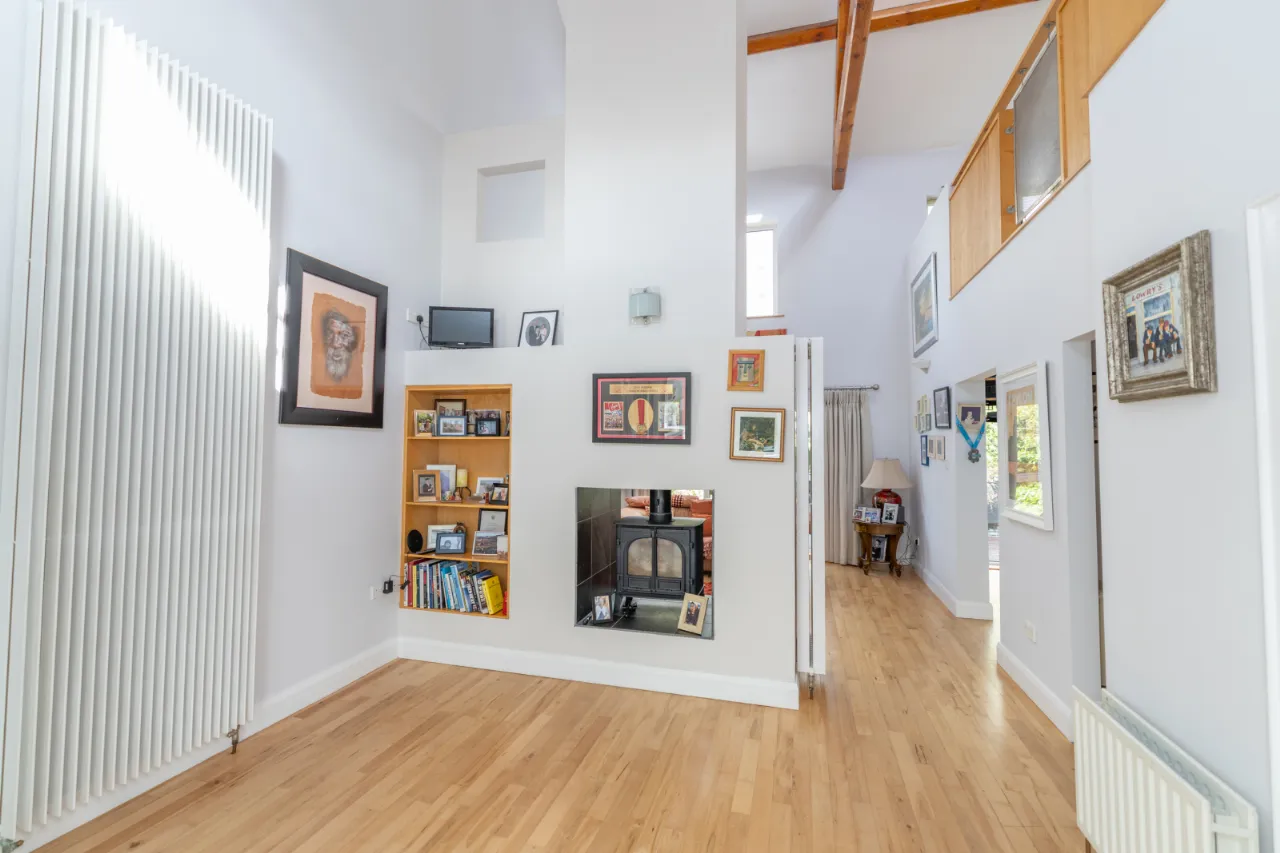 A bright and welcoming front-facing reception room featuring solid wood flooring and impressive high ceilings with exposed beams. Tall wall-mounted radiators enhance the space, while a striking double-sided stove creates a cosy focal point and subtly separates the lounge from the adjoining dining area.