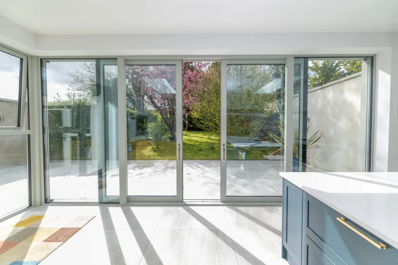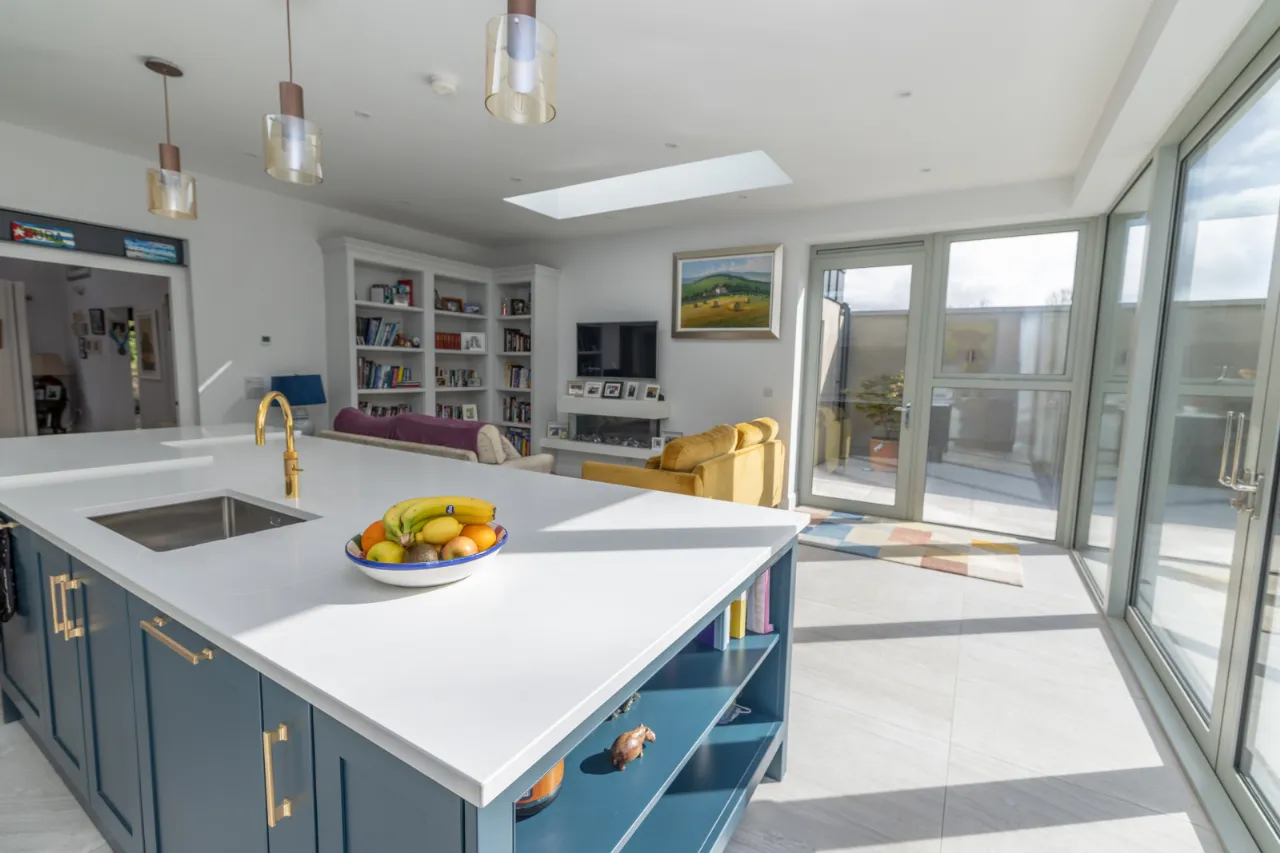 A superb open plan space featuring a high-quality Hannaway kitchen in a galley-style layout with quartz worktops and tiled splashback behind the hob. The central island unit includes a Quooker hot water tap, inset stainless steel sink, Bosch dishwasher, and integrated bin storage, along with a raised breakfast bar with quartz surface. The kitchen is further enhanced by a four-ring gas hob, two AEG electric ovens, and an integrated pantry with fridge freezer. The space also benefits from underfloor heating, adding comfort and efficiency throughout.
