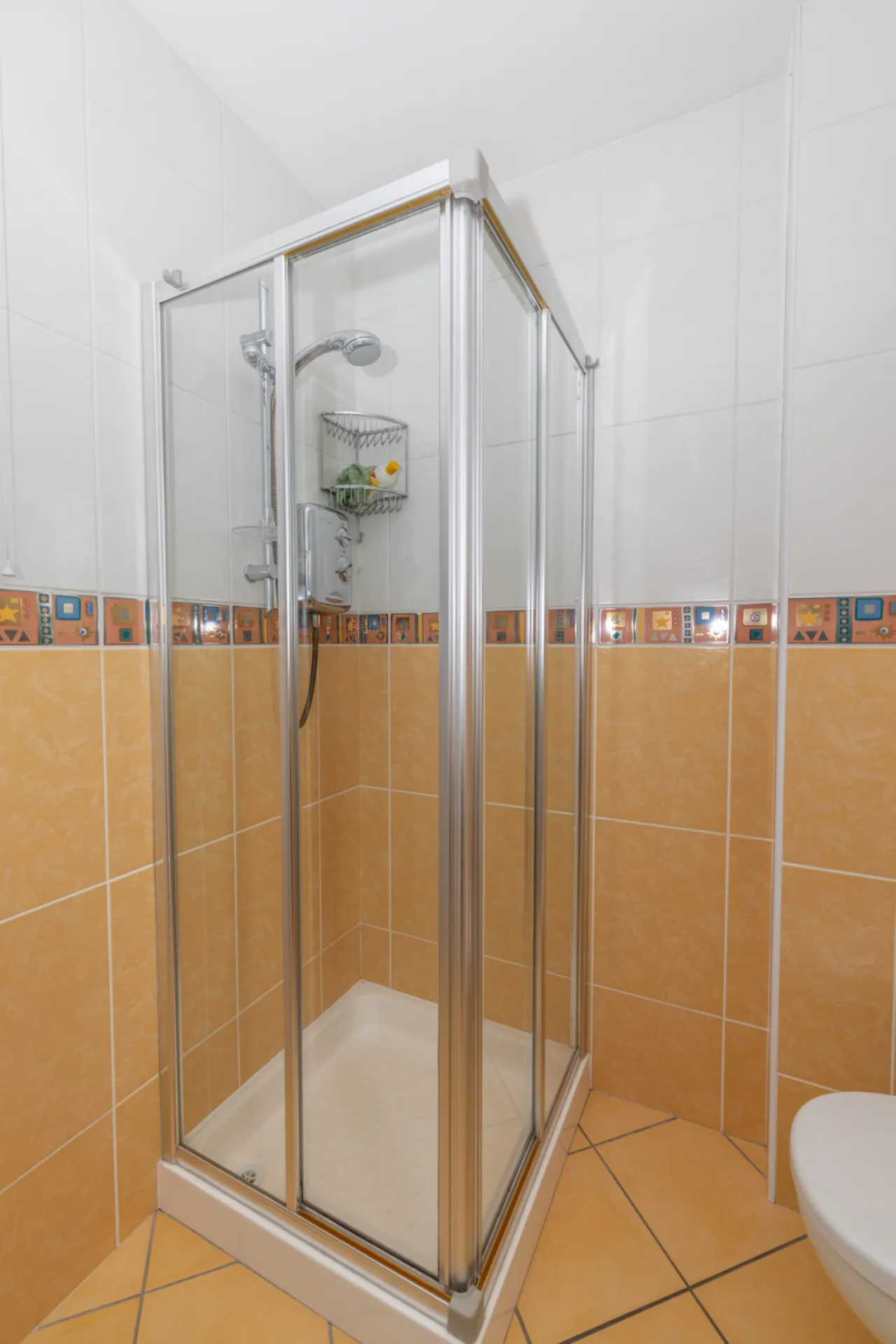 Fully tiled walls and floor, comprising a white suite with WC and wash hand basin, Triton Aspirante shower, and heated towel rail.