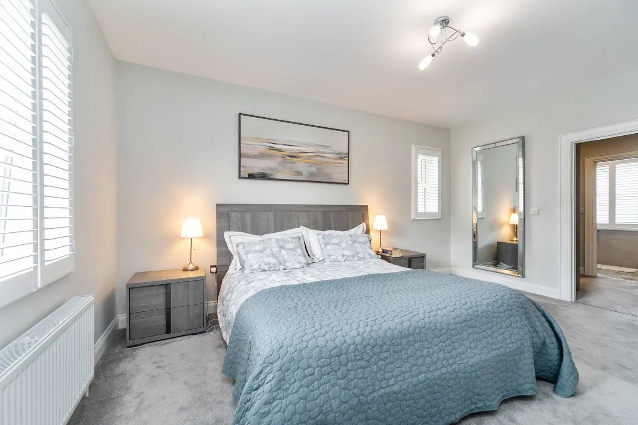 Spotlighting, tiled floor, range of high and low units, 1.5 inset composite sink with mixer taps, quartz worktops, 5 ring gas hob, glass and stainless steel extractor fan. Double electric oven, integrated dishwasher, pull out bin, space for American fridge freezer, space for wine fridge, double uPVC doors leading outside