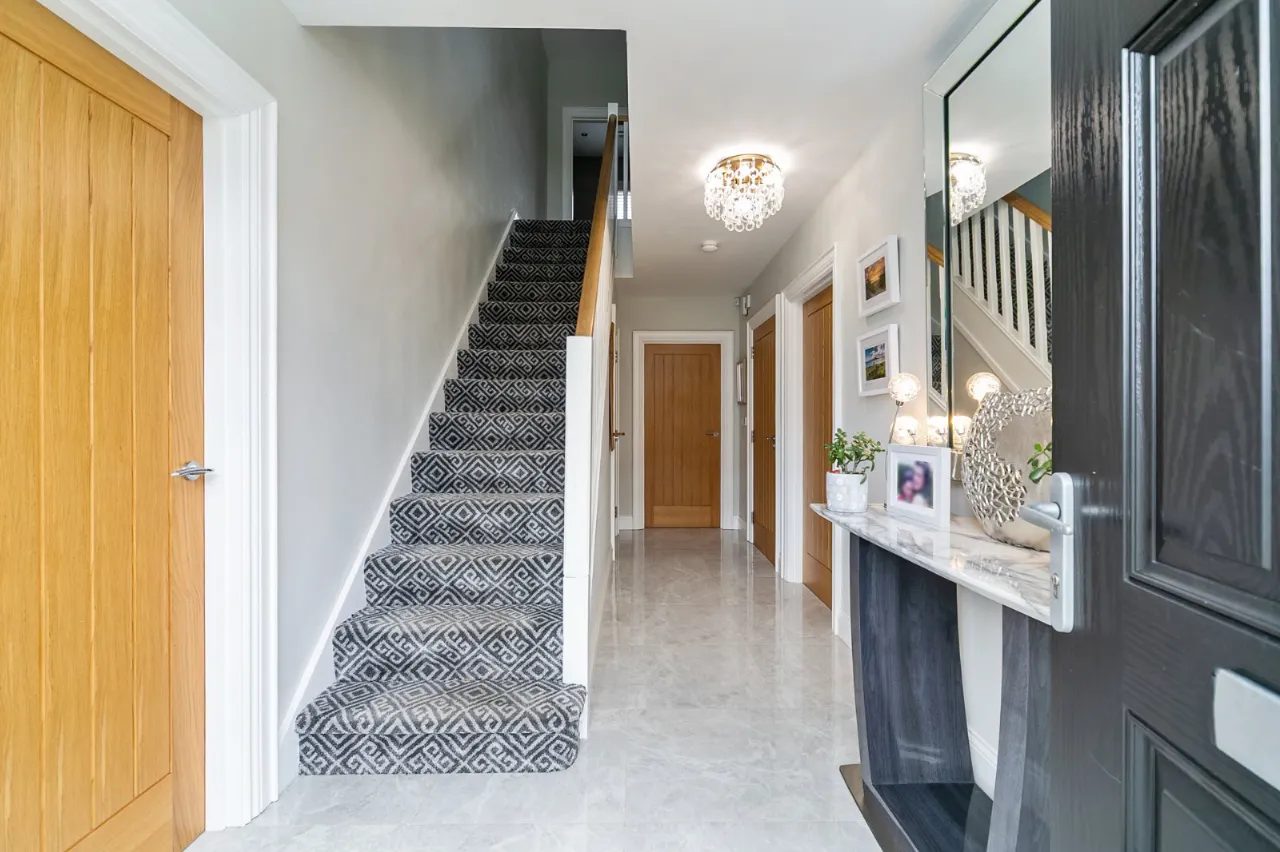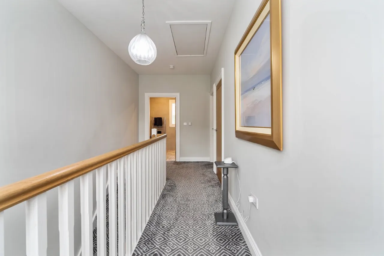 Low flush WC, pedestal wash hand basin, fully tiled shower cubicle, spotlighting, chrome heated towel radiator