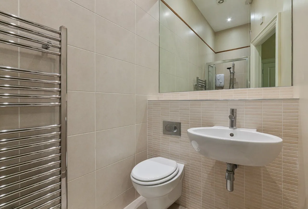 Wash hand basin, WC, heated towel rail, corner shower cubicle, ceramic tiled floor, part tiled walls, extractor fan