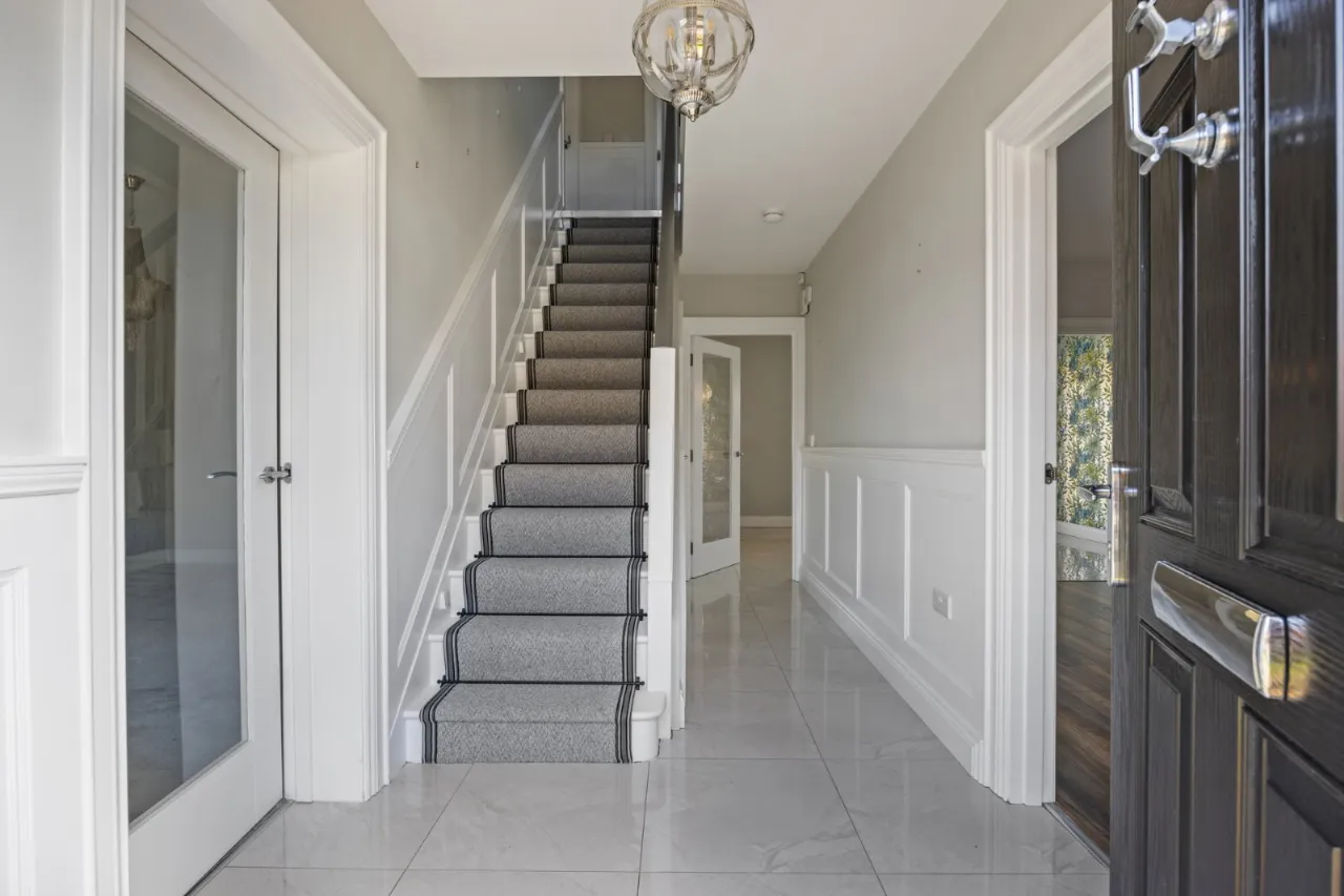 Composite front door to hall with tiled floor, understairs storage cupboard, wood panelled walls