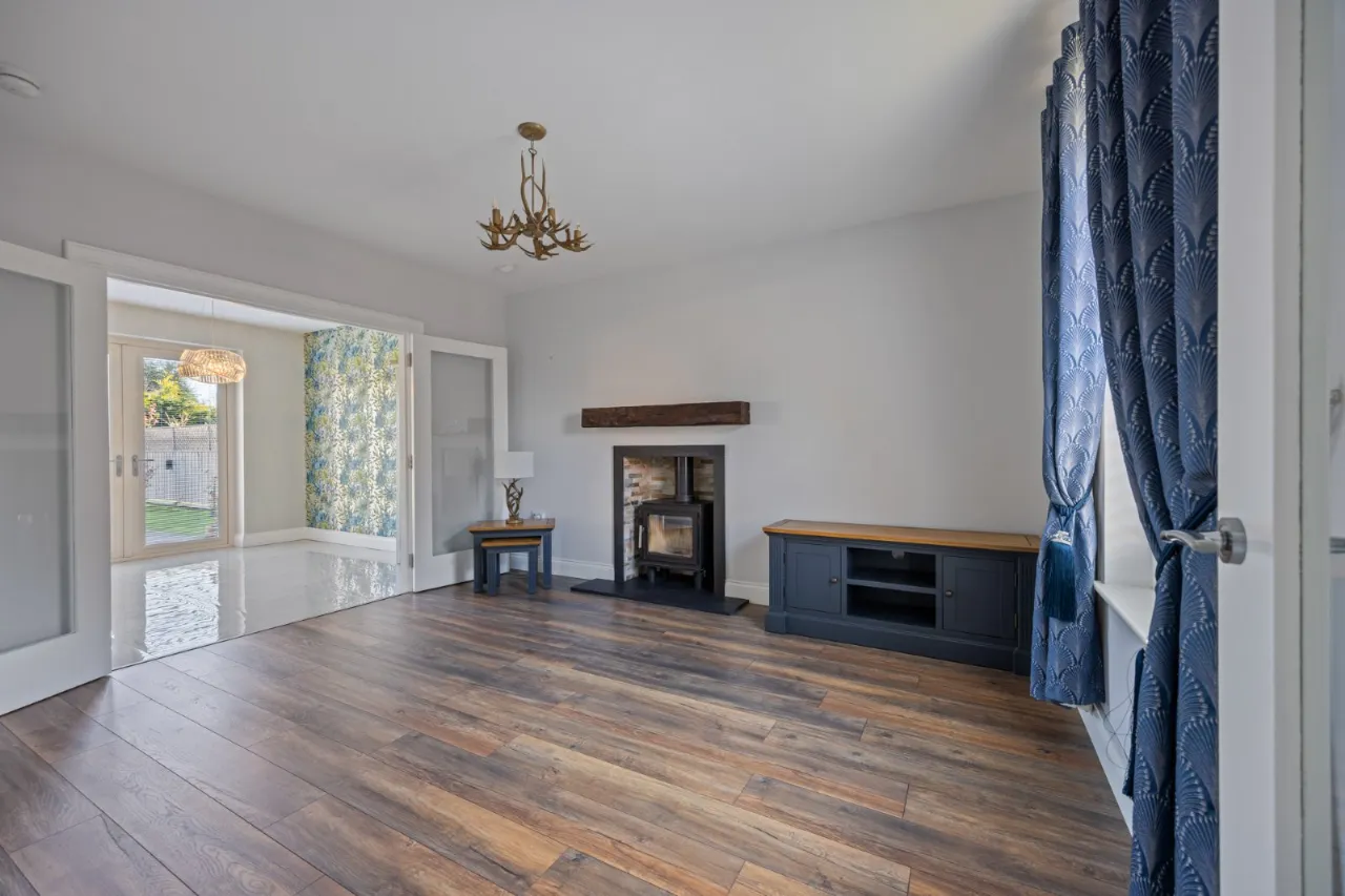 Laminate wood floor, wood burning stove, double doors to kitchen