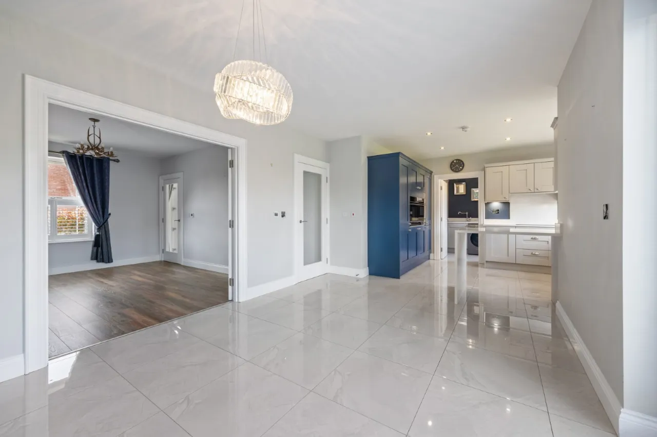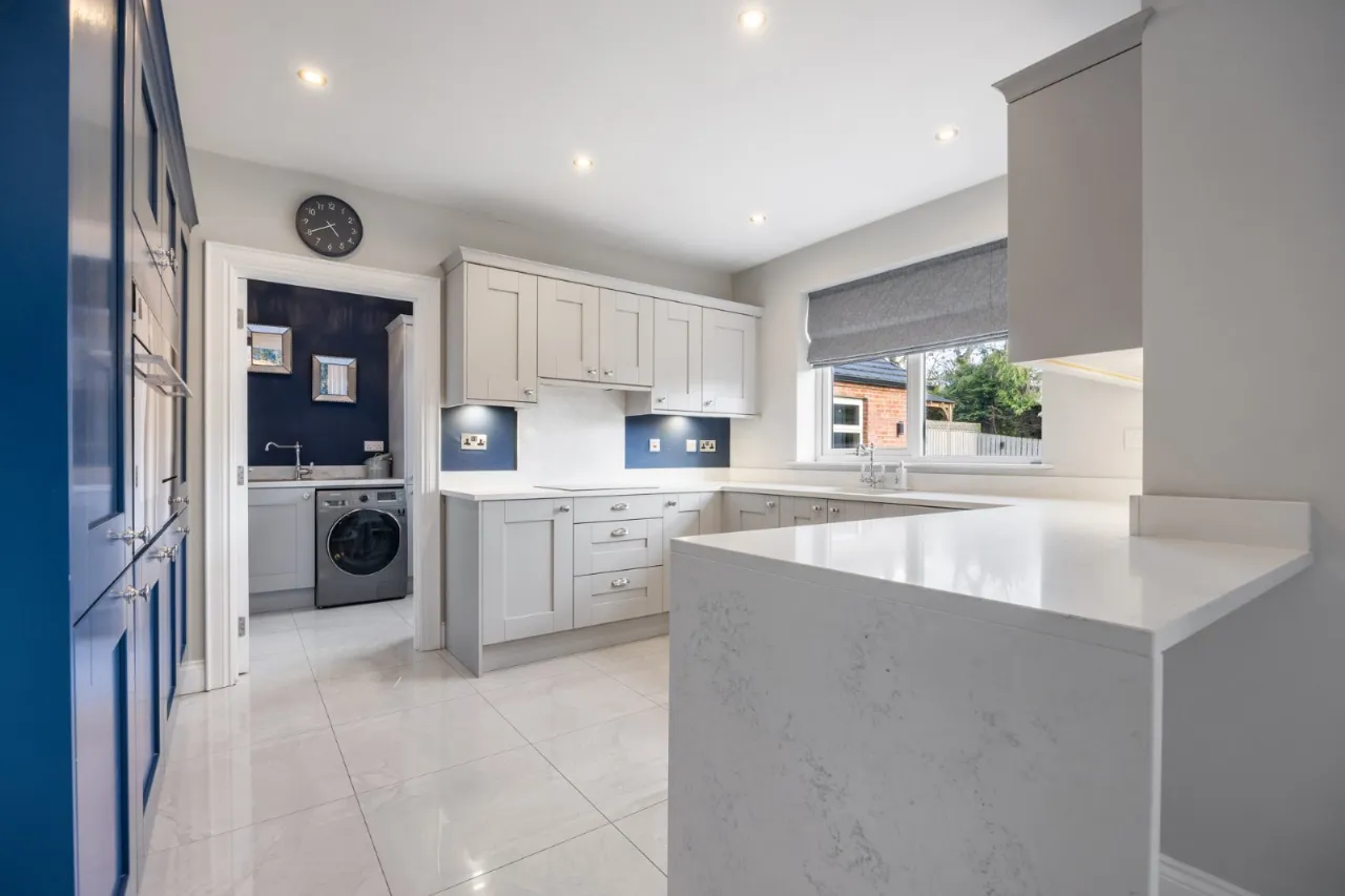 Tiled floor, spotlighting, range of high and low level units, quartz worktops, inset sink, integrated dishwasher, wine fridge, ceramic hob, extractor fan, electric oven, integrated microwave, integrated fridge freezer