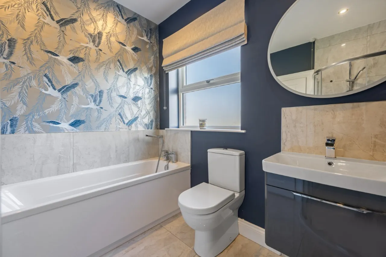 Tiled floor, pedestal wash hand basin with vanity unit, low flush WC, extractor fan