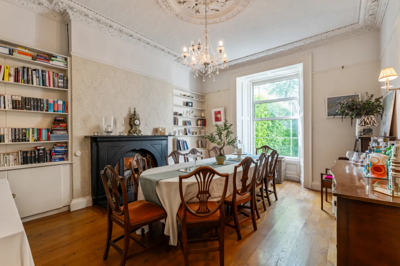 Bay window overlooking gardens. Picture rail. Ornate cornice work and ceiling rose. Feature fireplace with open fire, tiled inset and slate hearth. Built in book shelves.