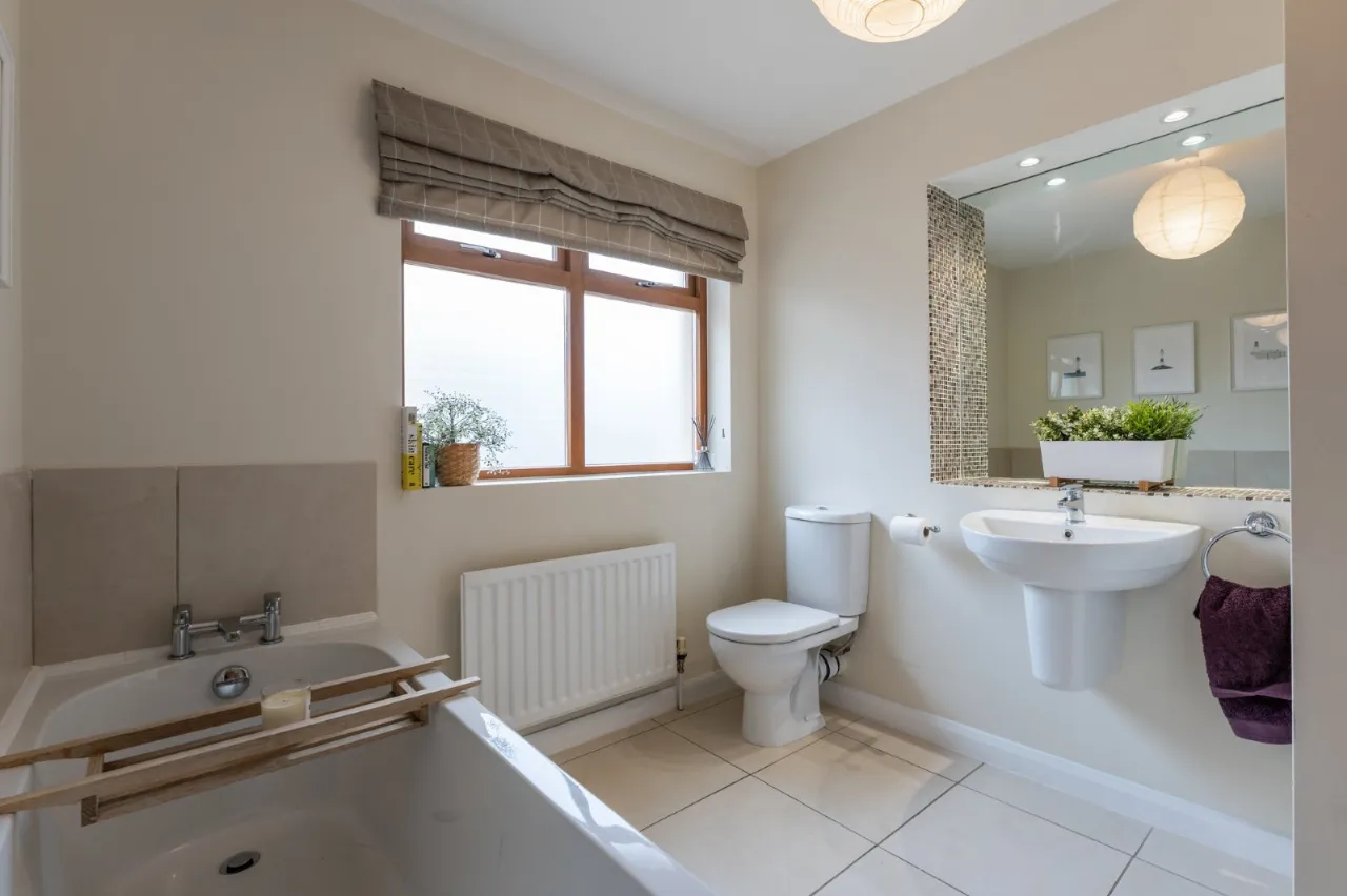Contemporary suite comprising: Low flush WC, wash hand basin with feature mirror and lighting above, panelled bath with chrome mixer tap, fully tiled shower enclosure with chrome shower fitments, tiled floor, partly tiled walls.