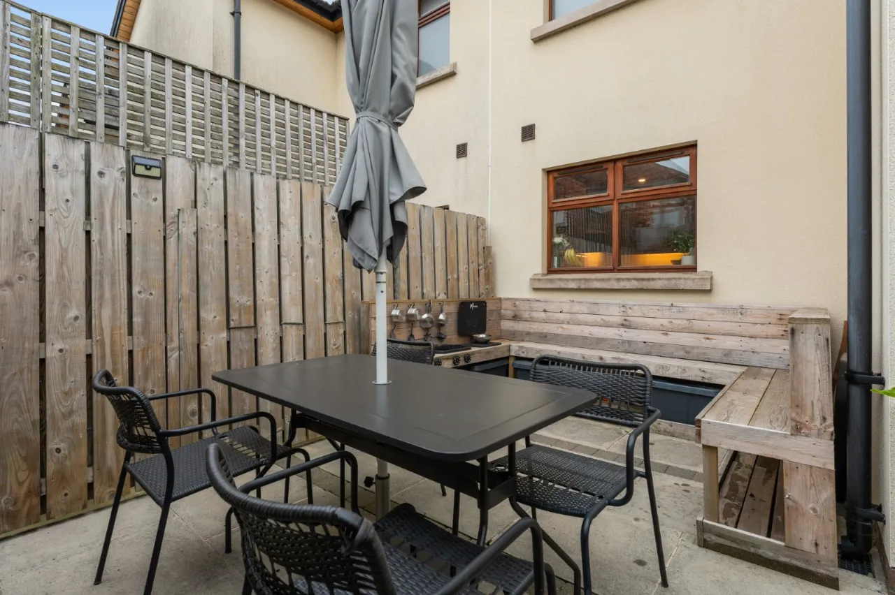 Enclosed rear yard in paving. Brick pavior driveway parking to front for 2 cars.