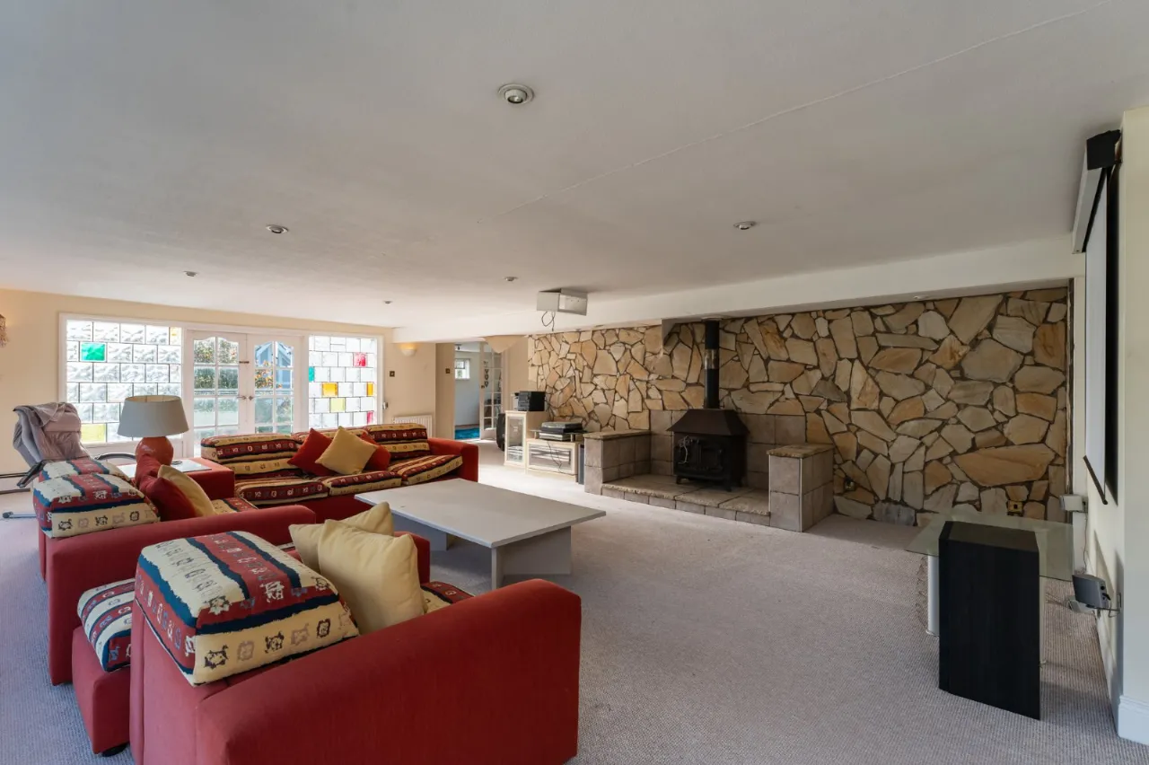 Outlook over front garden, stone fireplace with free standing cast iron stove, double doors to terrace area.