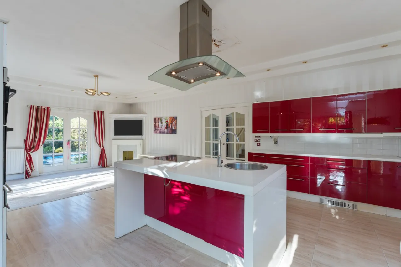 Range of high and low level units, laminate work surfaces, island unit, integrated dishwasher, ceramic hob, circular stainless steel sink unit, aluminium sliding doors to patio and garden, integrated high level oven, hardwood glazed door to rear garden, stainless steel extractor fan above hob.