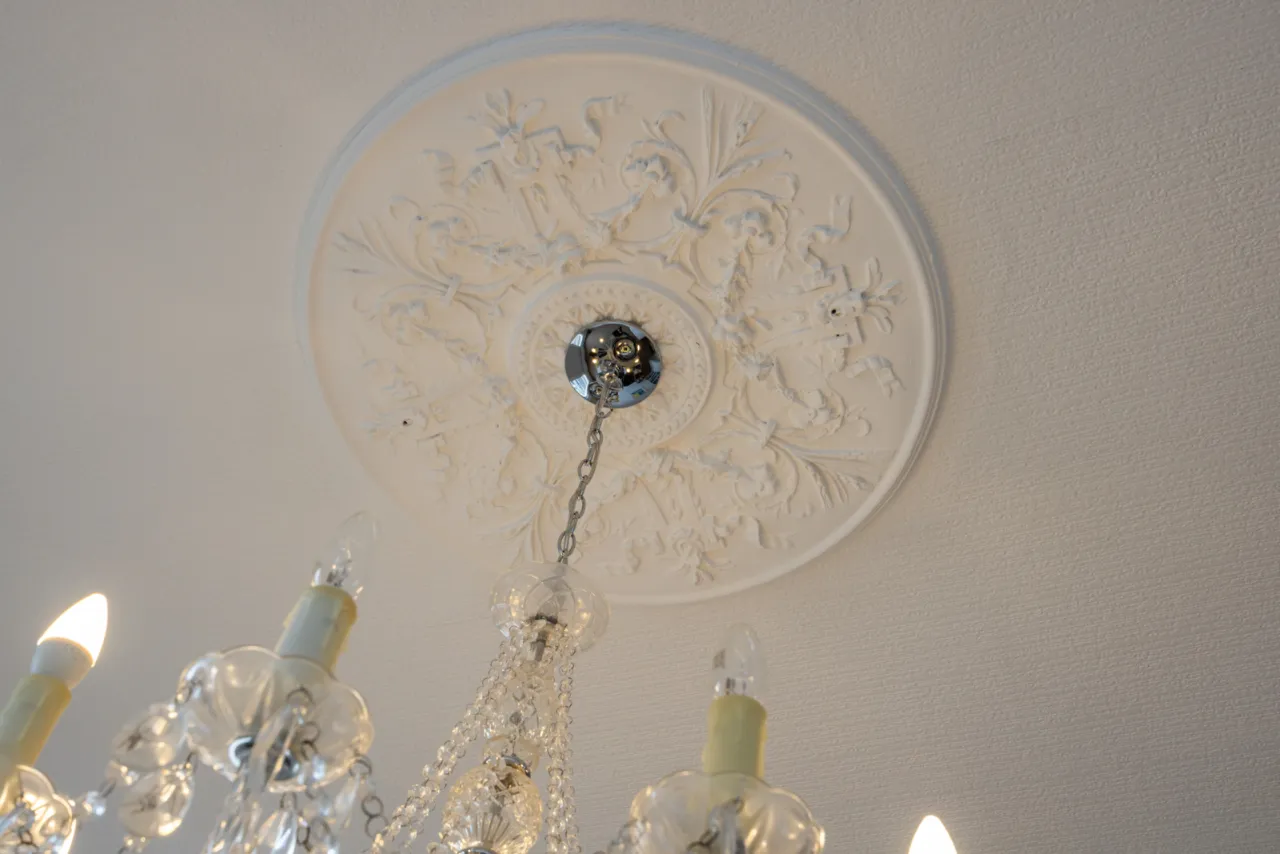 Solid wood flooring, picture rail, corniced ceiling, ceiling rose.
