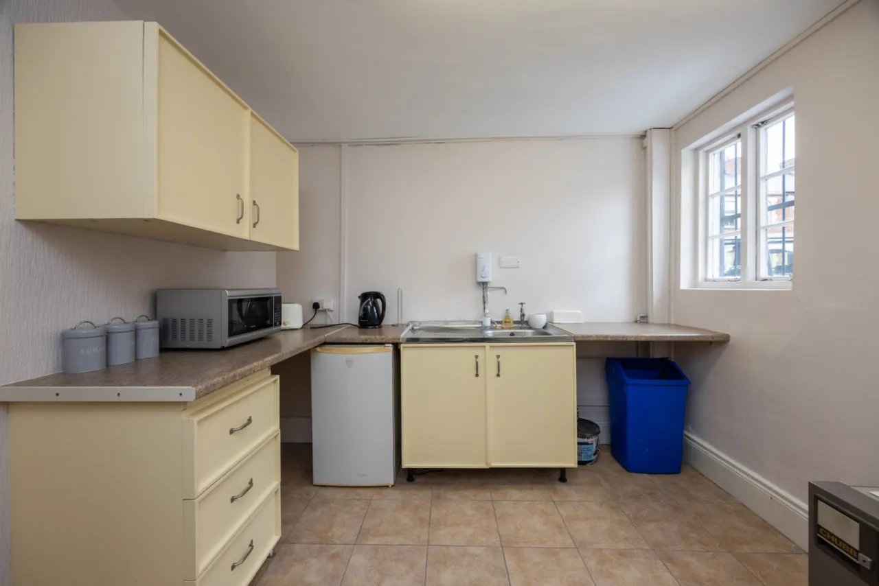 Range of low level units, laminate work surfaces, single drainer stainless steel sink unit, ceramic tiled floor, oil fired boiler.