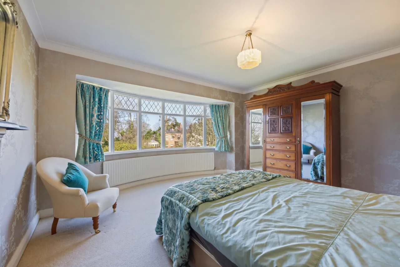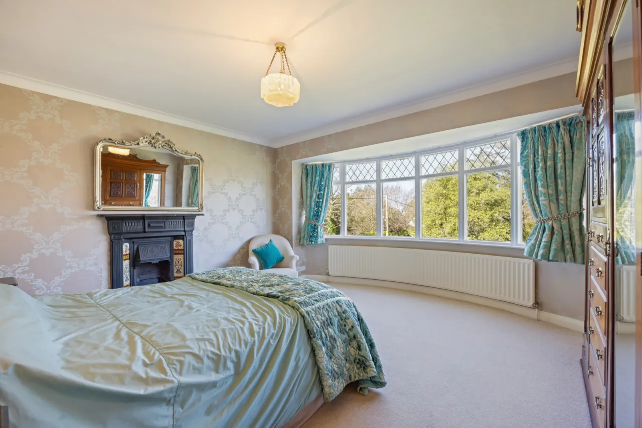 Corniced ceiling, outlook to mature garden, circular bay, feature cast iron and tiled fireplace.