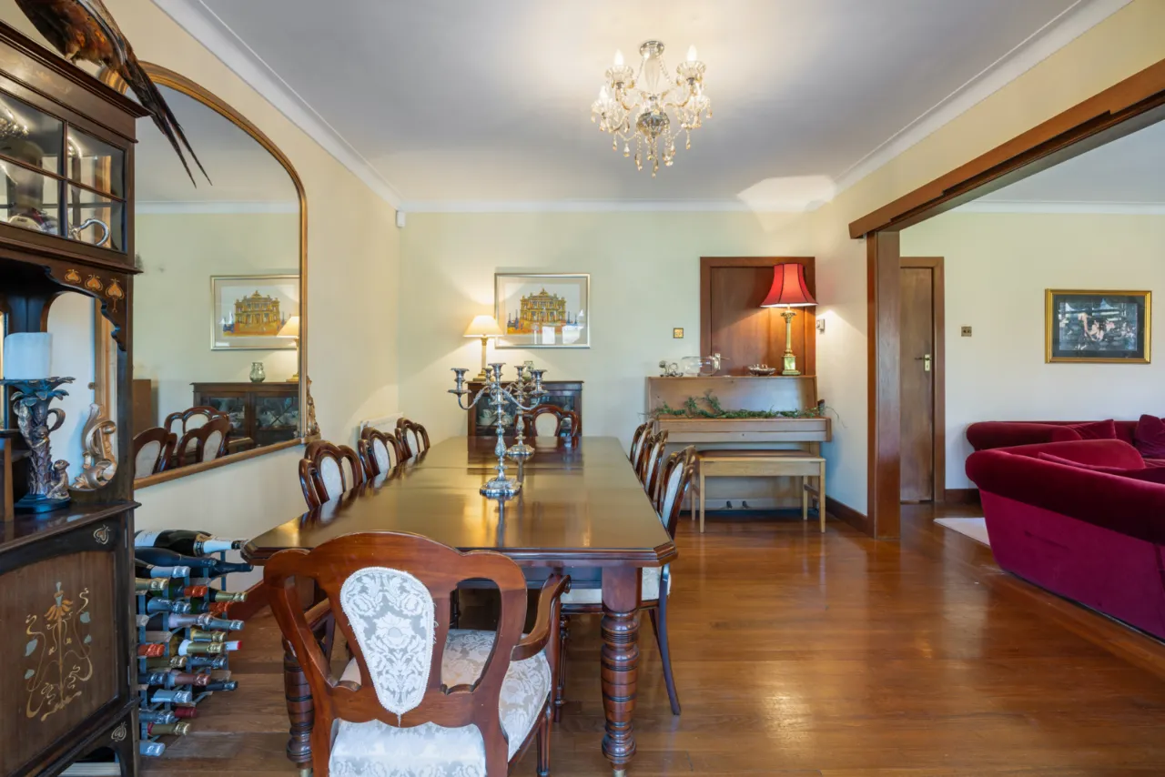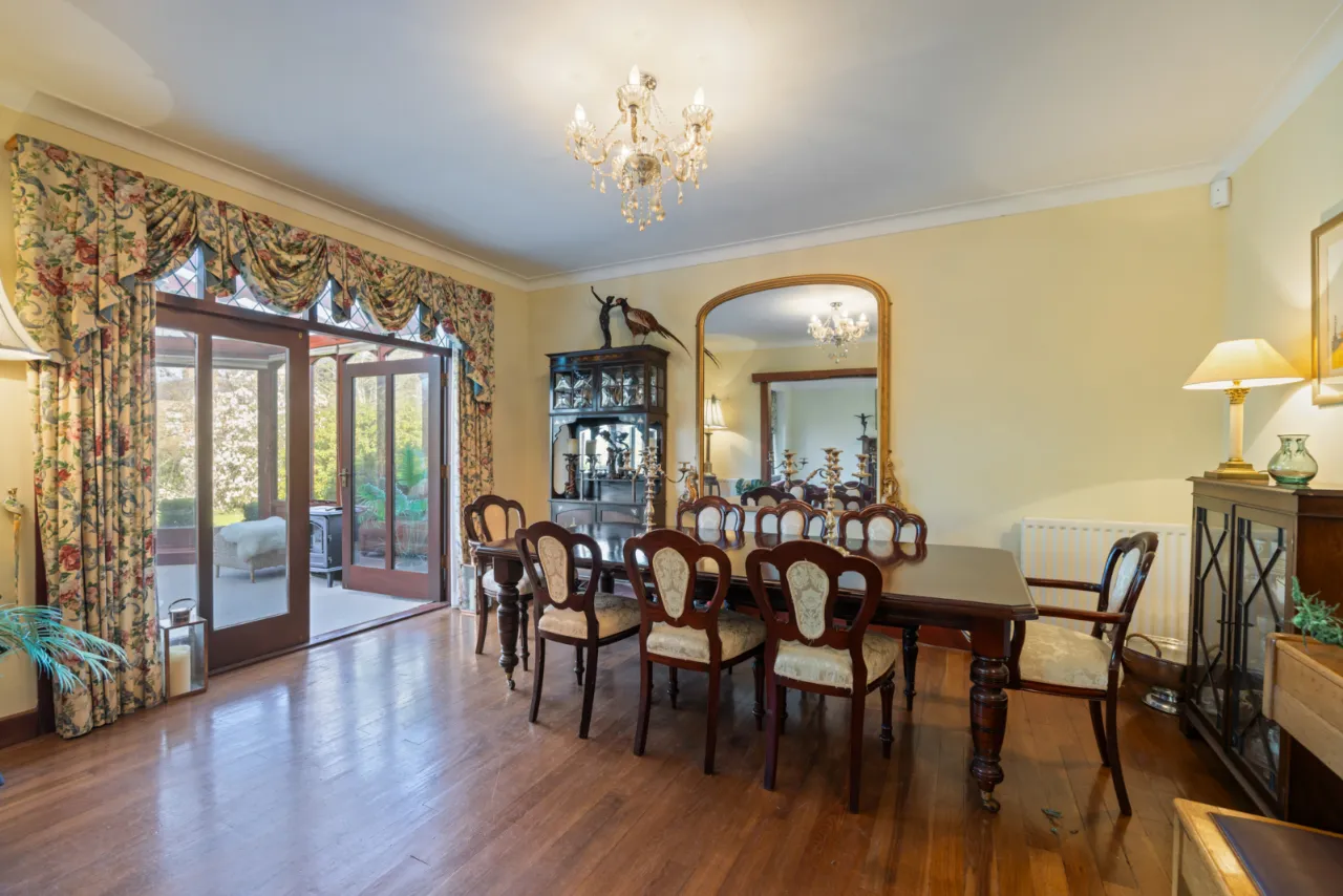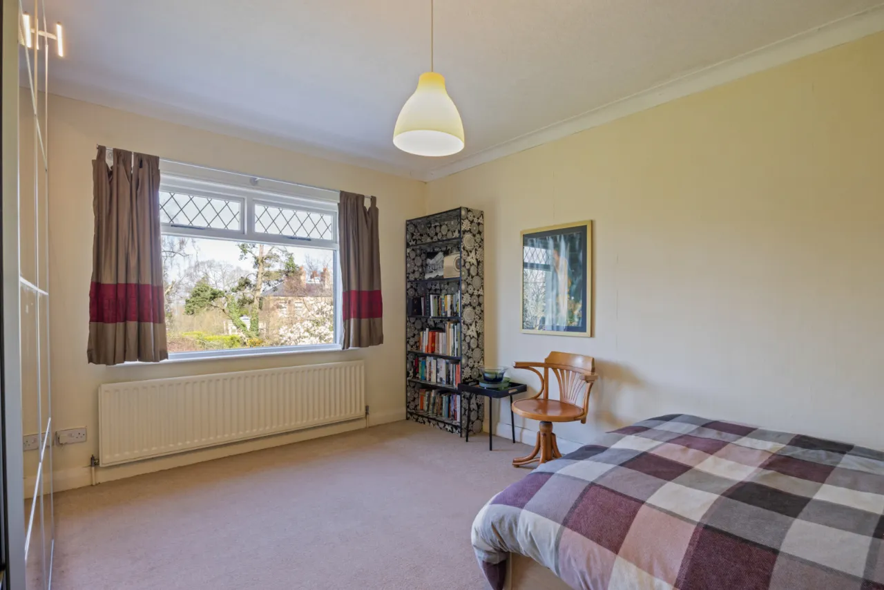 Outlook mature garden, corniced ceiling.