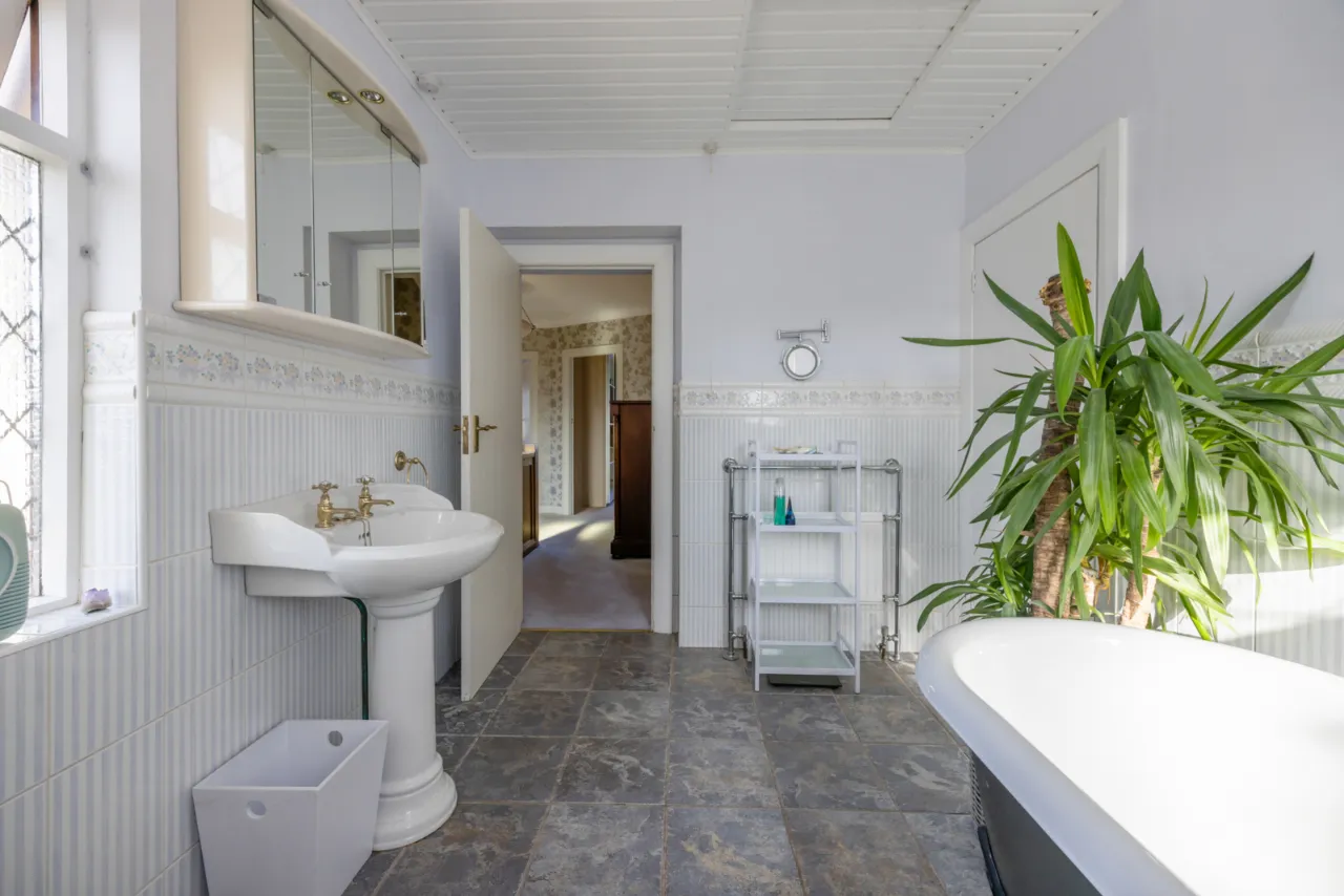 White suite comprising: High flush WC, pedestal wash hand basin, free standing bath with mixer taps and telephone hand shower, hotpress with copper cylinder and built in shelving above, access to roofspace, ceramic tiled floor.