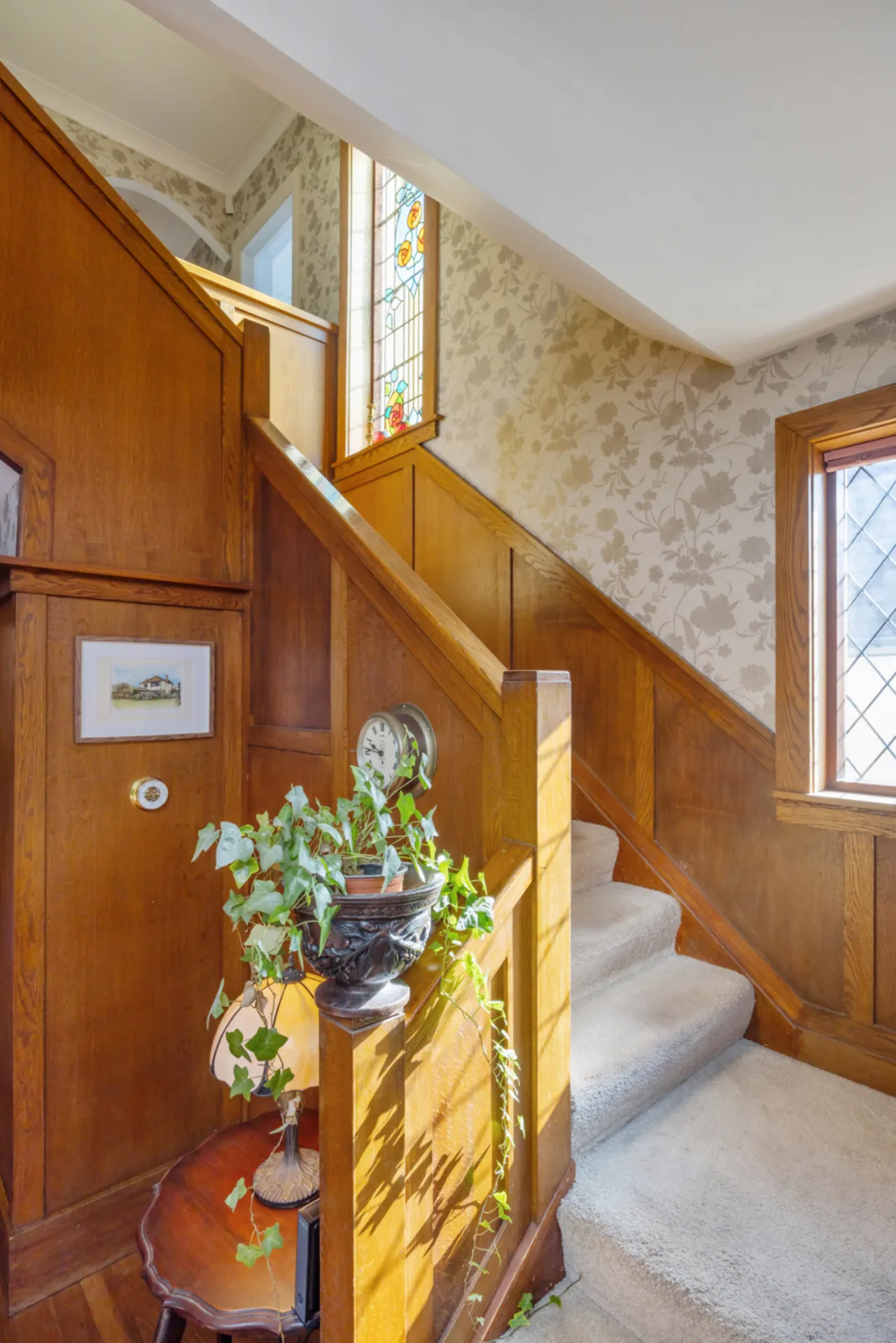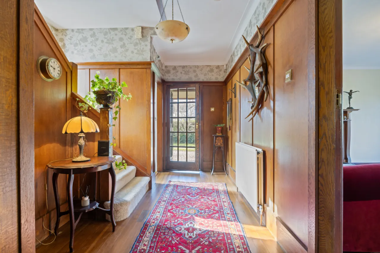 Solid oak wood flooring, wood panelling, corniced ceiling, under stairs storage cupboard.
