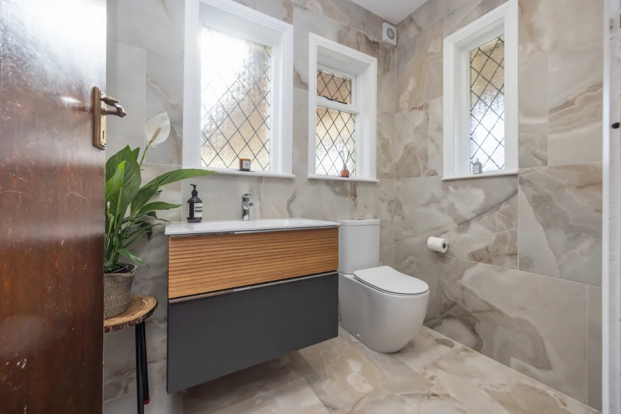 Contemporary white suite comprising: Low flush WC, wash hand basin with chrome mixer taps set in vanity unit, fully tiled walls, ceramic tiled floor, heated towel radiator, extractor fan, illuminated wall mirror.