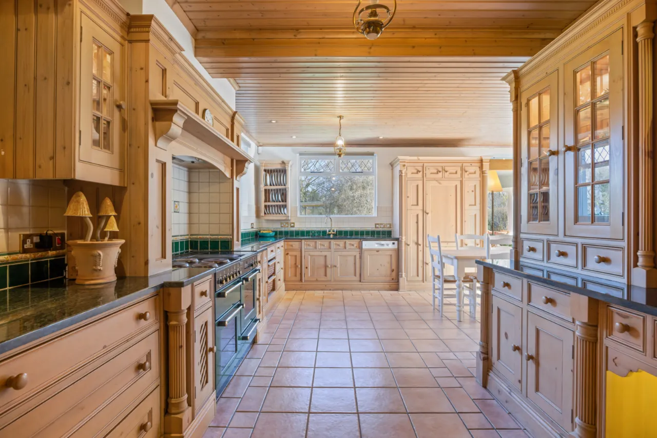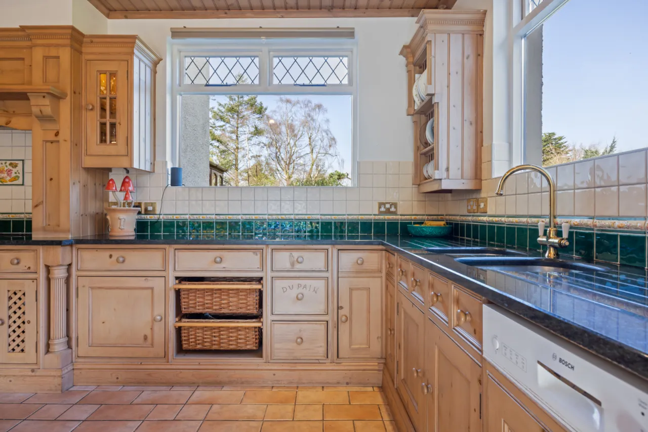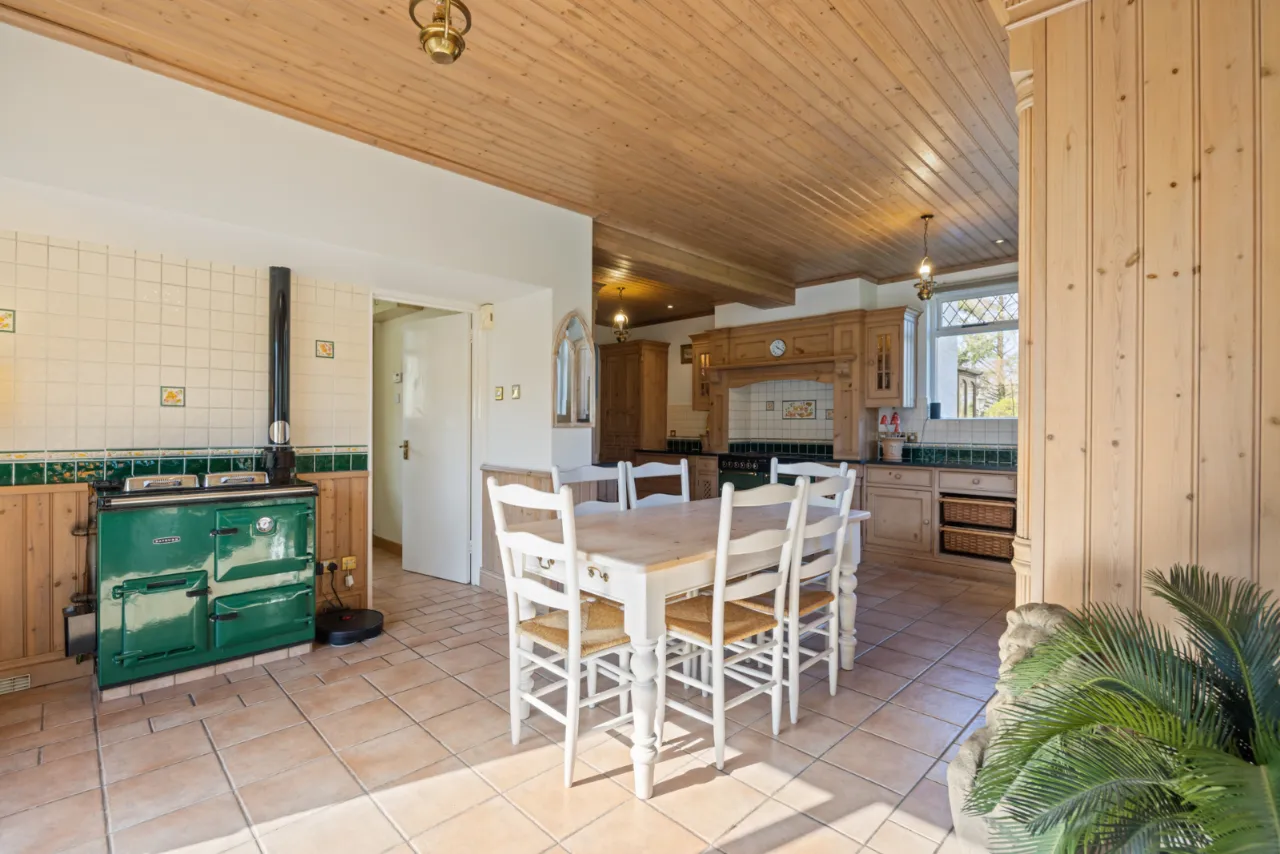 Bespoke fitted pine kitchen with range of high and low level units, granite work surfaces, inset twin sink unit and chrome mixer taps, built in pantry, built in shelving and plate racks, Rayburn stove, ceramic tiled floor, space for range cooker, integrated fridge and freezer, integrated dishwasher, mahogany double glazed sliding doors to patio and garden.
