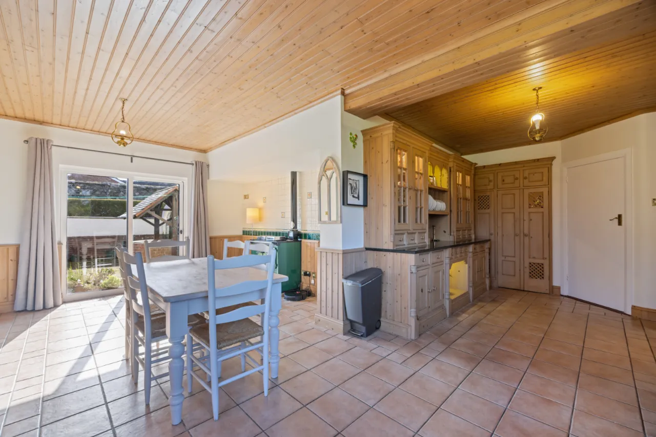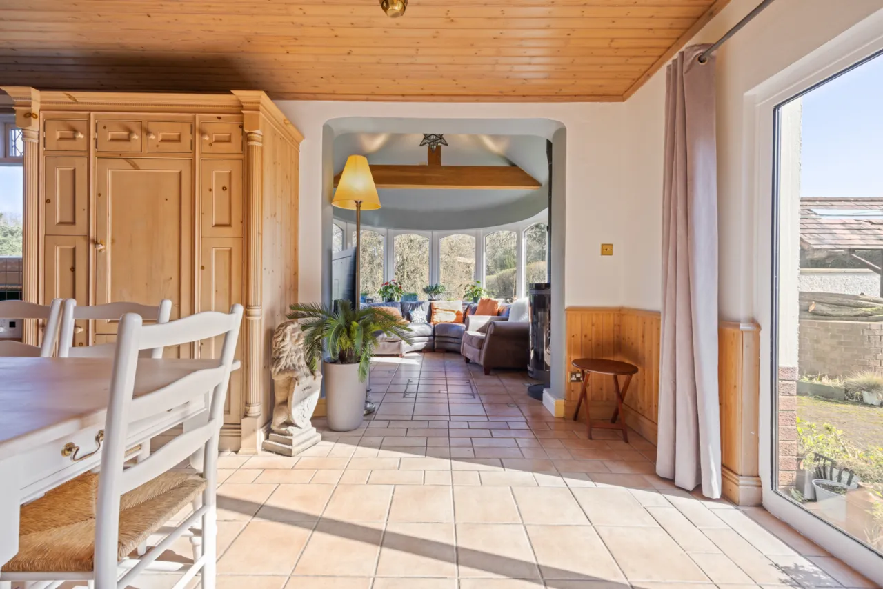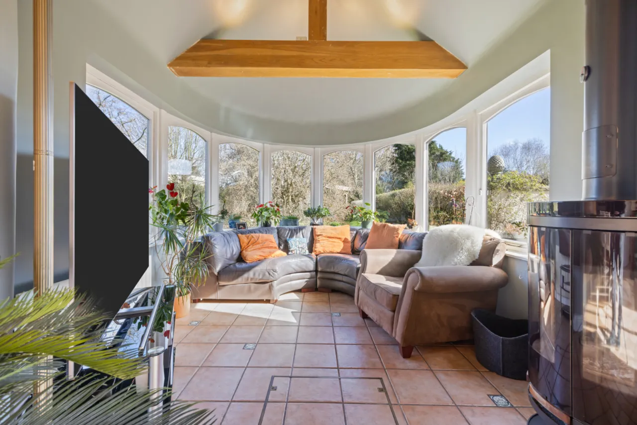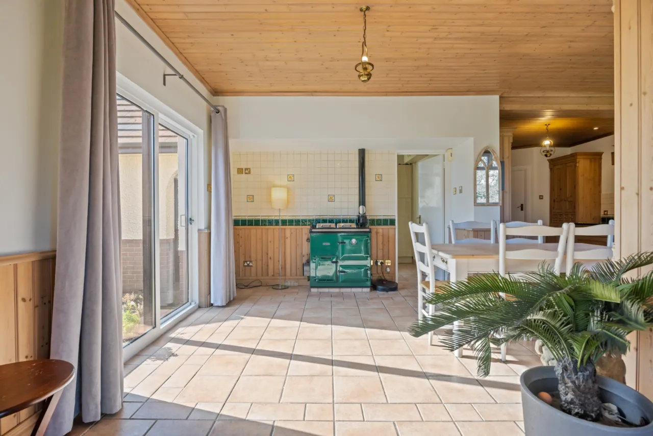 Ceramic tiled floor, vaulted ceiling, wood burning stove, outlook to garden.
