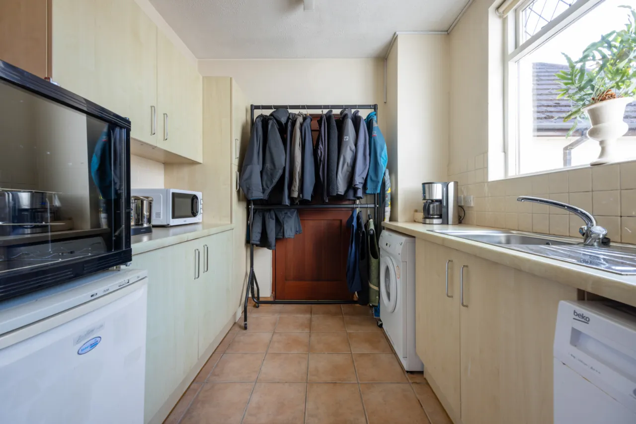 Range of high and low level units, laminate work surfaces, single drainer stainless steel sink unit with chrome mixer taps, plumbed for washing machine, vented for tumble dryer, leading to rear door.