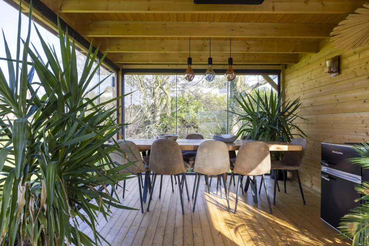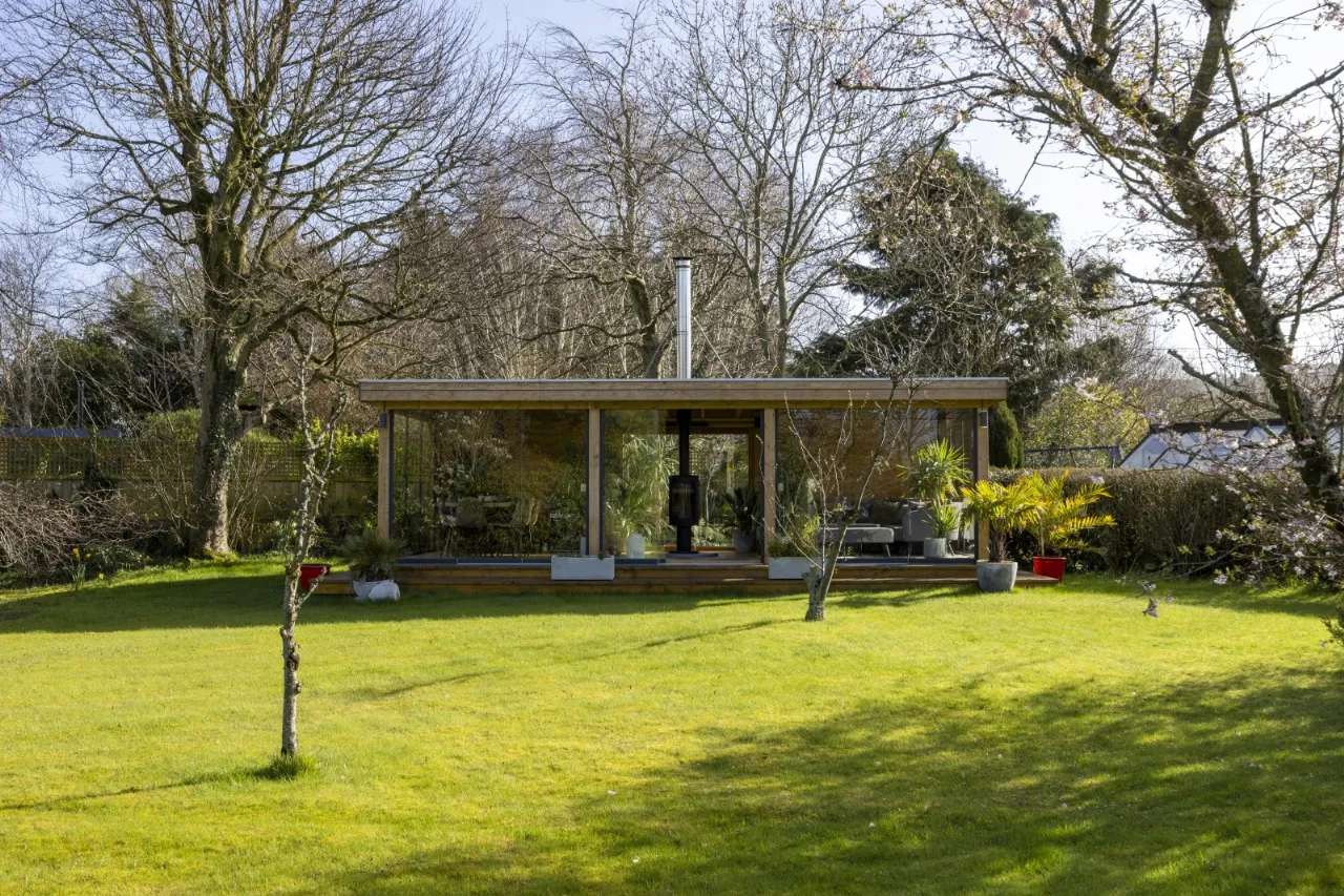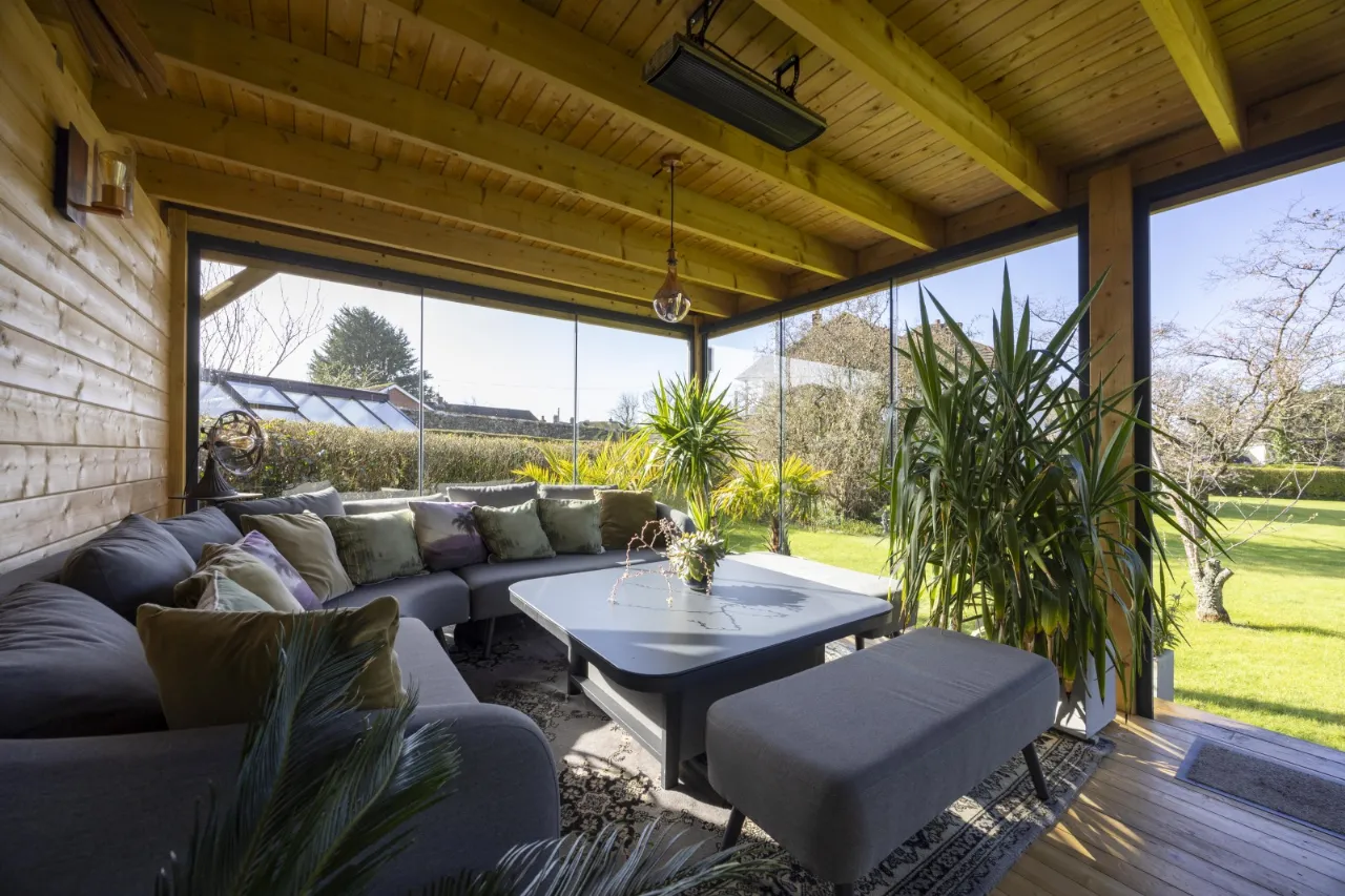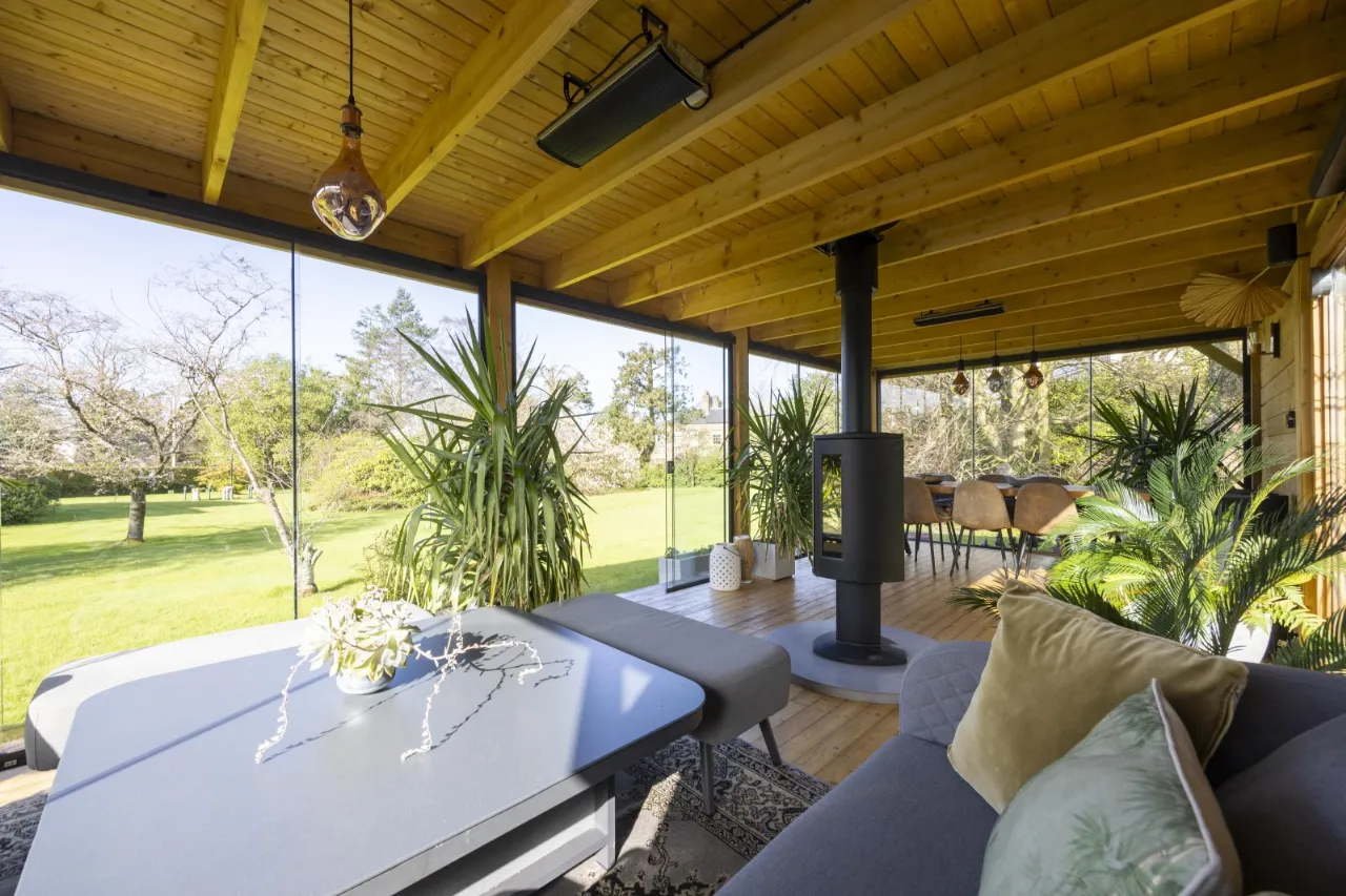 Featuring dining and seating areas, sliding glass doors to front and sides, double glazed panel to rear, Infrared thermostatically controlled heating, cast iron wood burning stove with concrete hearth, light and power including external floodlighting.