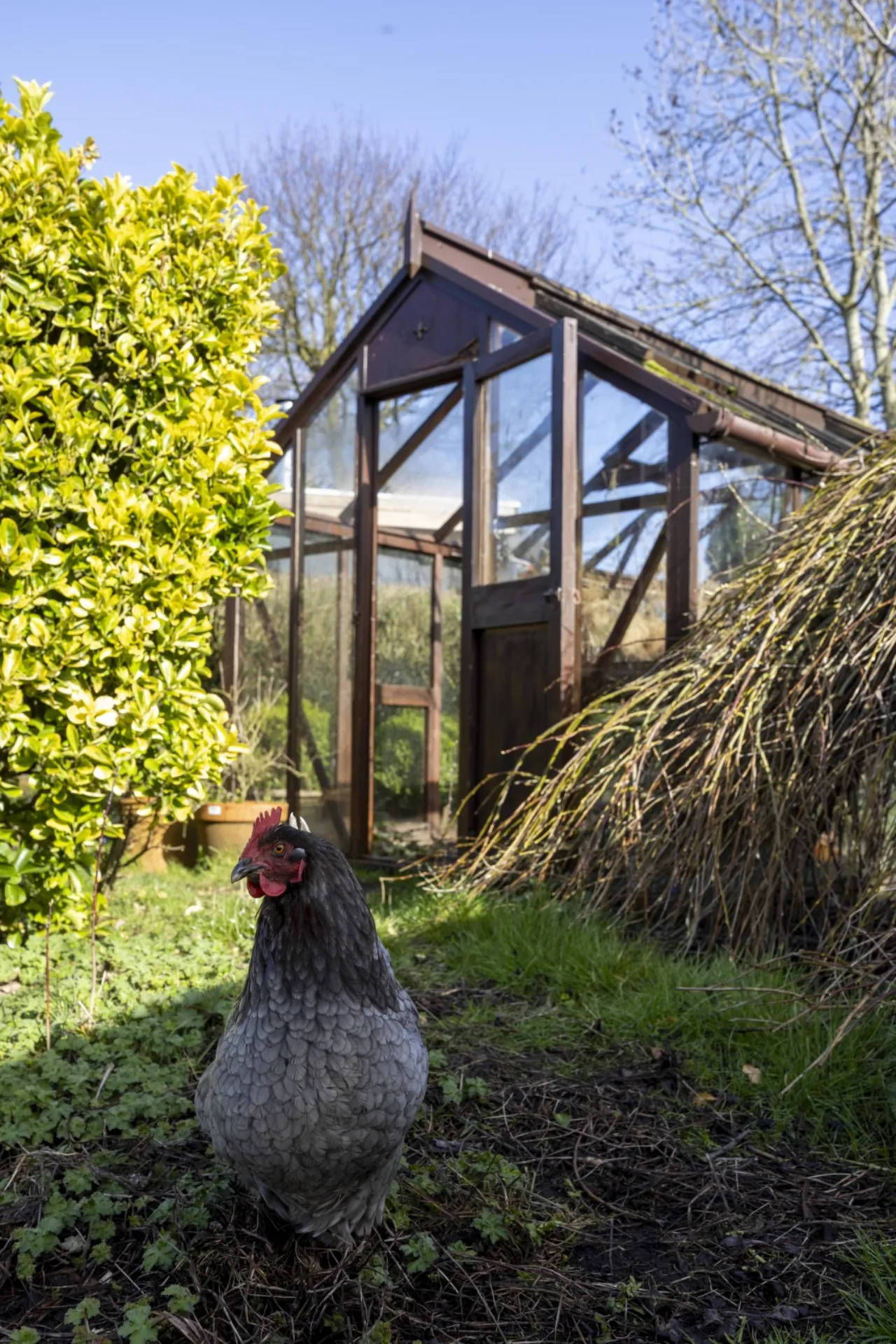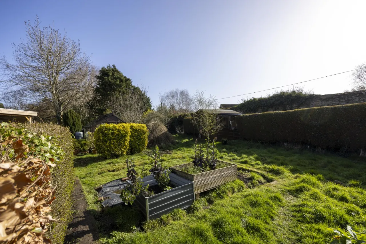 Walled enclosure. Sensor lighting, outside lighting and floodlights. Outside tap. Leading to vegetable garden.