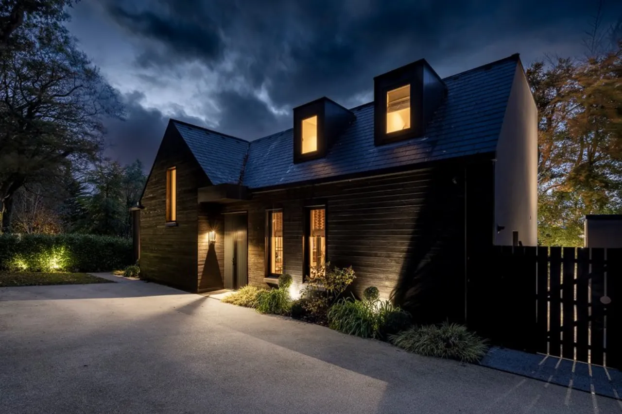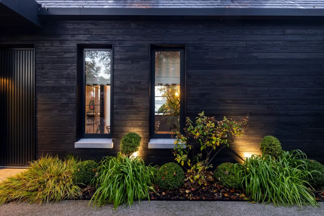 Remote sliding electric gates with intercom system linked to mobile phone. Resin bonded driveway with parking for three cars. Mature shrub beds with feature lighting. Laid in lawns. Access to each side via secure gates.