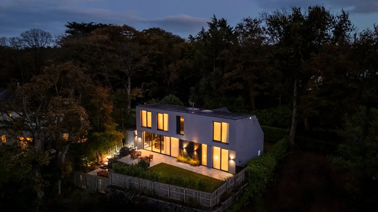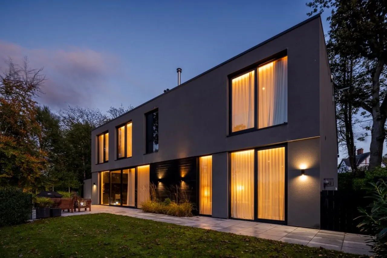 Large paved patio area with glass balustrades. Steps down to further sunken sheltered patio area. Laid in lawns. Feature planting and shrub beds. Secure fence and hedge boundary. Feature lighting throughout.