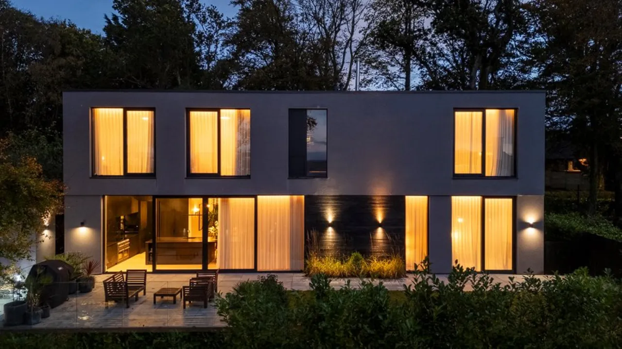 Striking floor to ceiling Crittal effect walls with sliding door to main open plan living space. Bespoke staircase with feature lighting. Wood effect tiled floor. Recessed lighting. Feature cove lighting. Large understairs storage area with communications hub for Lutron lighting system, underfloor heating, alarm and cctv.