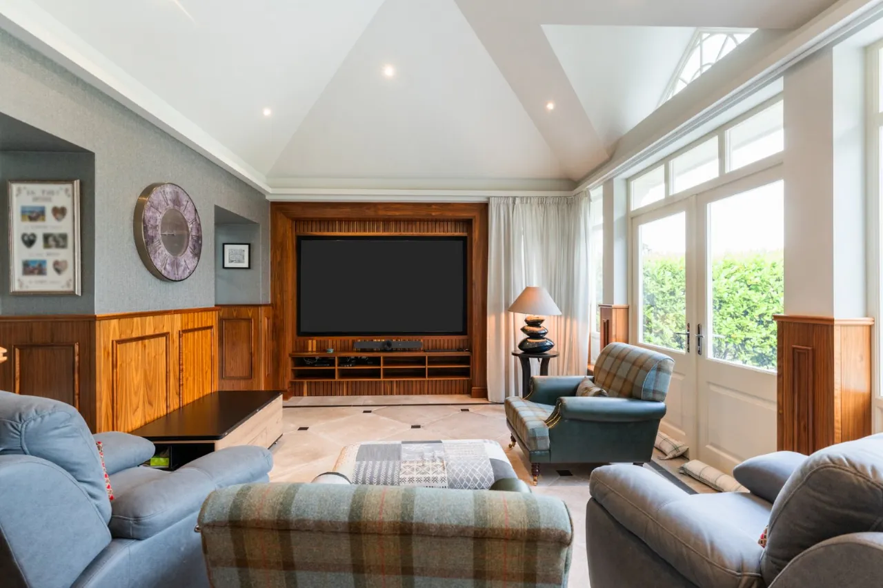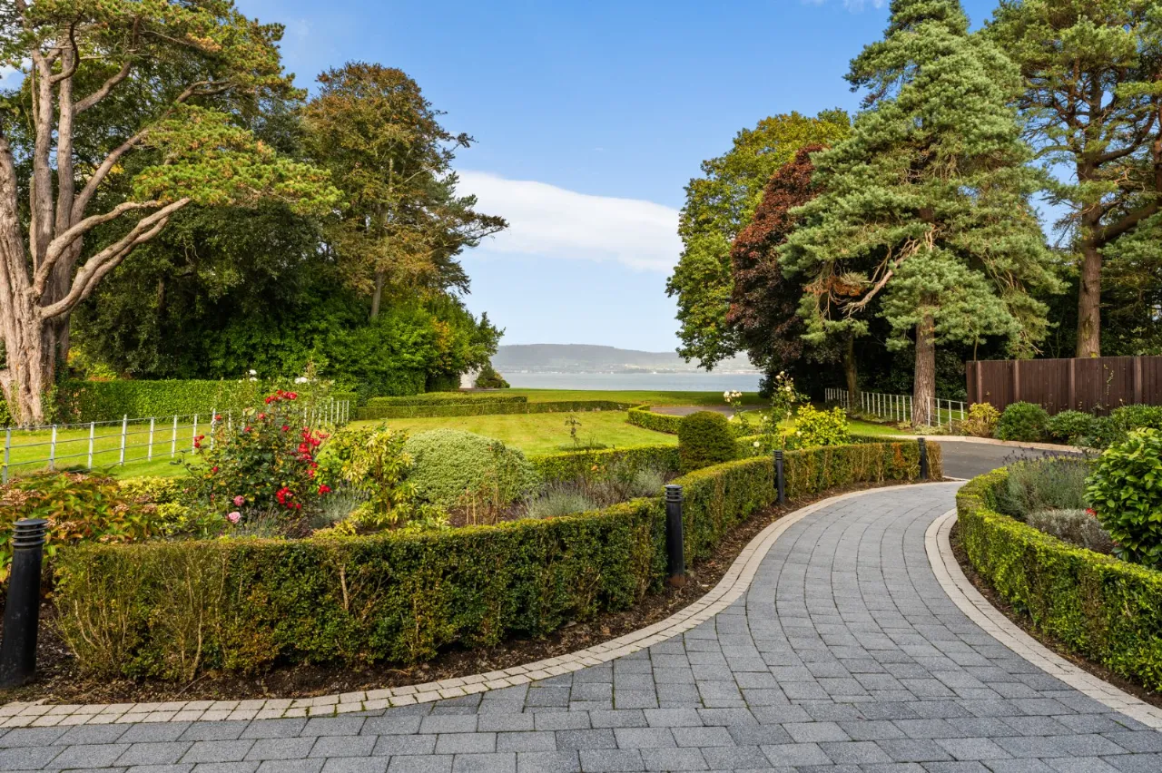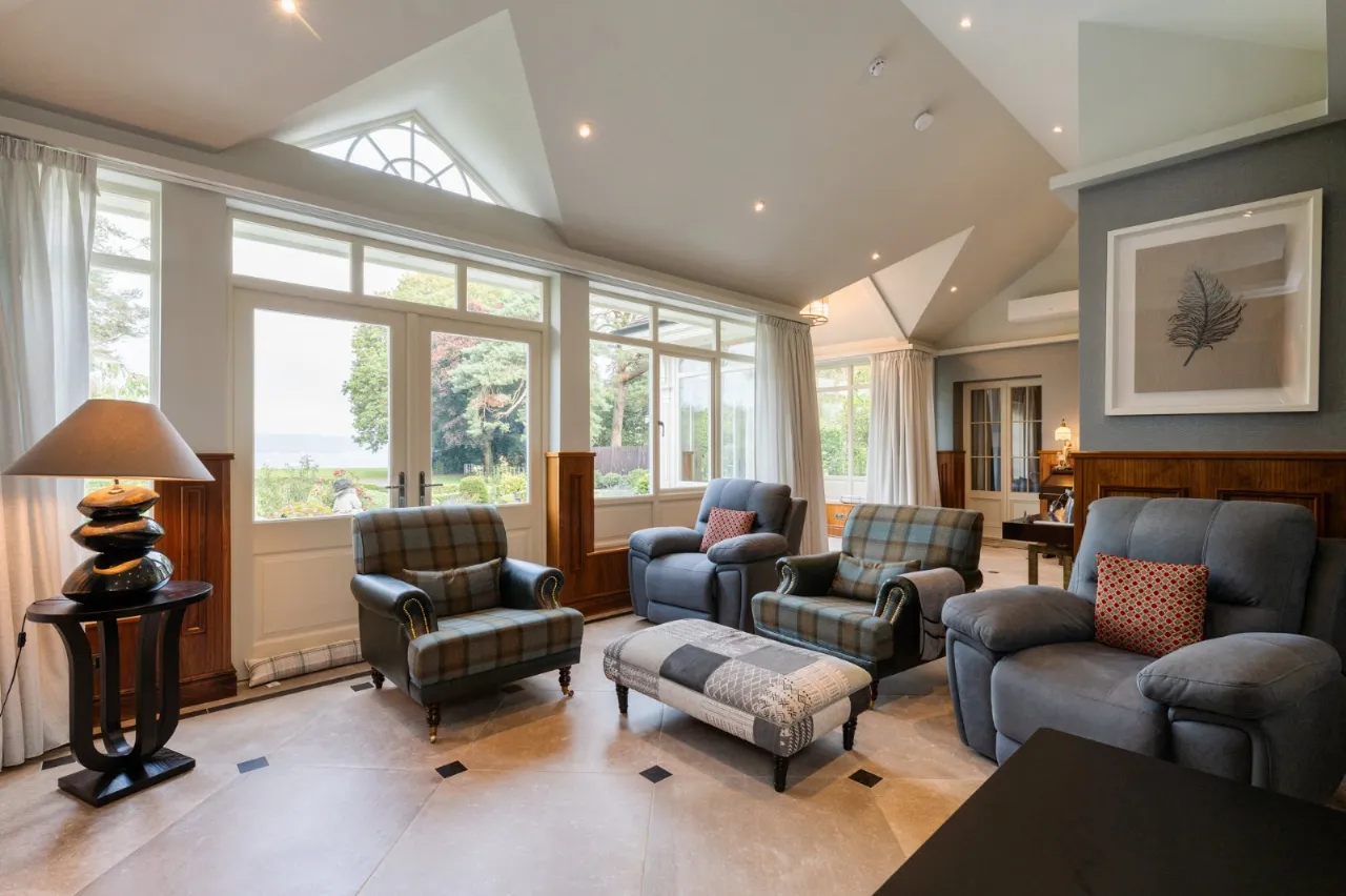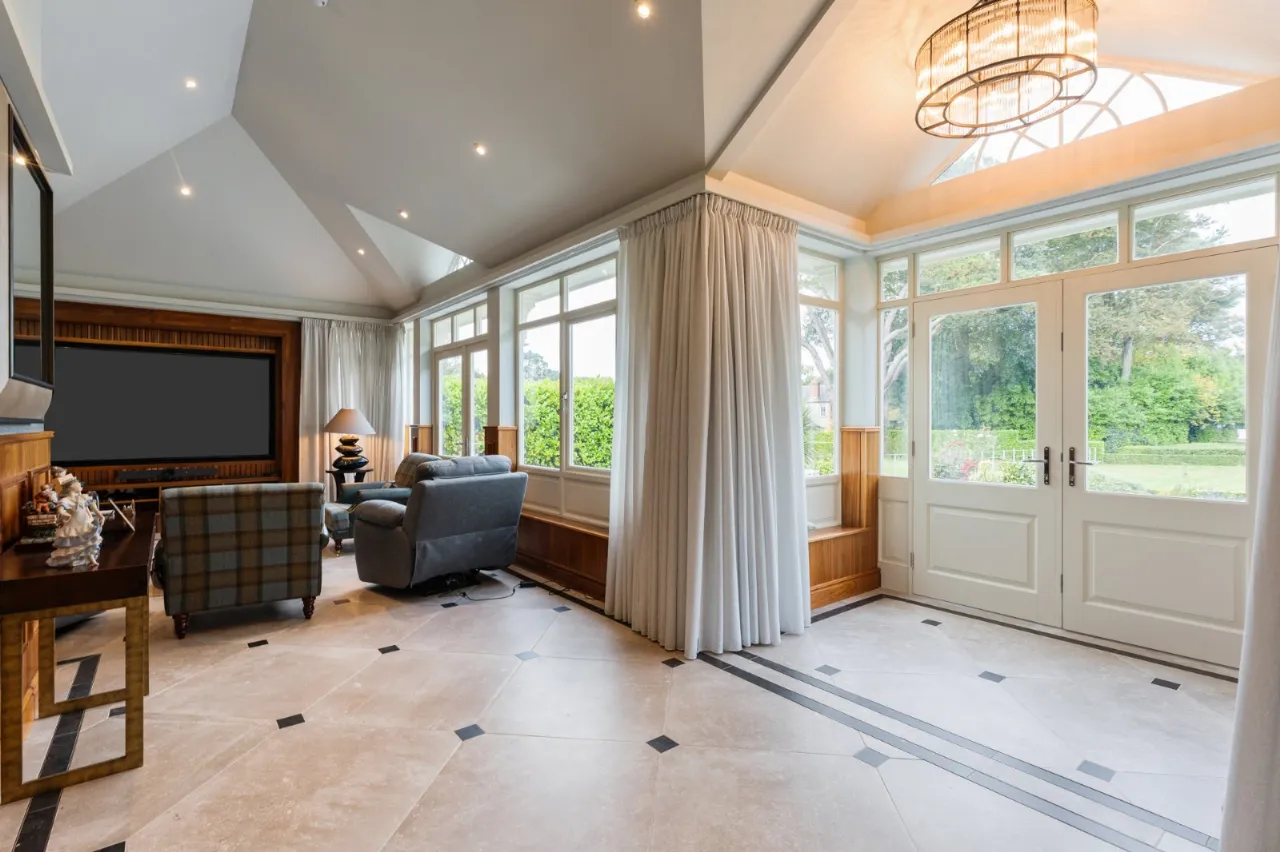 Views over garden to Belfast Lough. Two sets of French doors leading to garden. Vaulted ceiling, tiled floor, walnut panelled walls, media wall, concealed lighting. Access from Kitchen, Hallway and Drawing Room.
