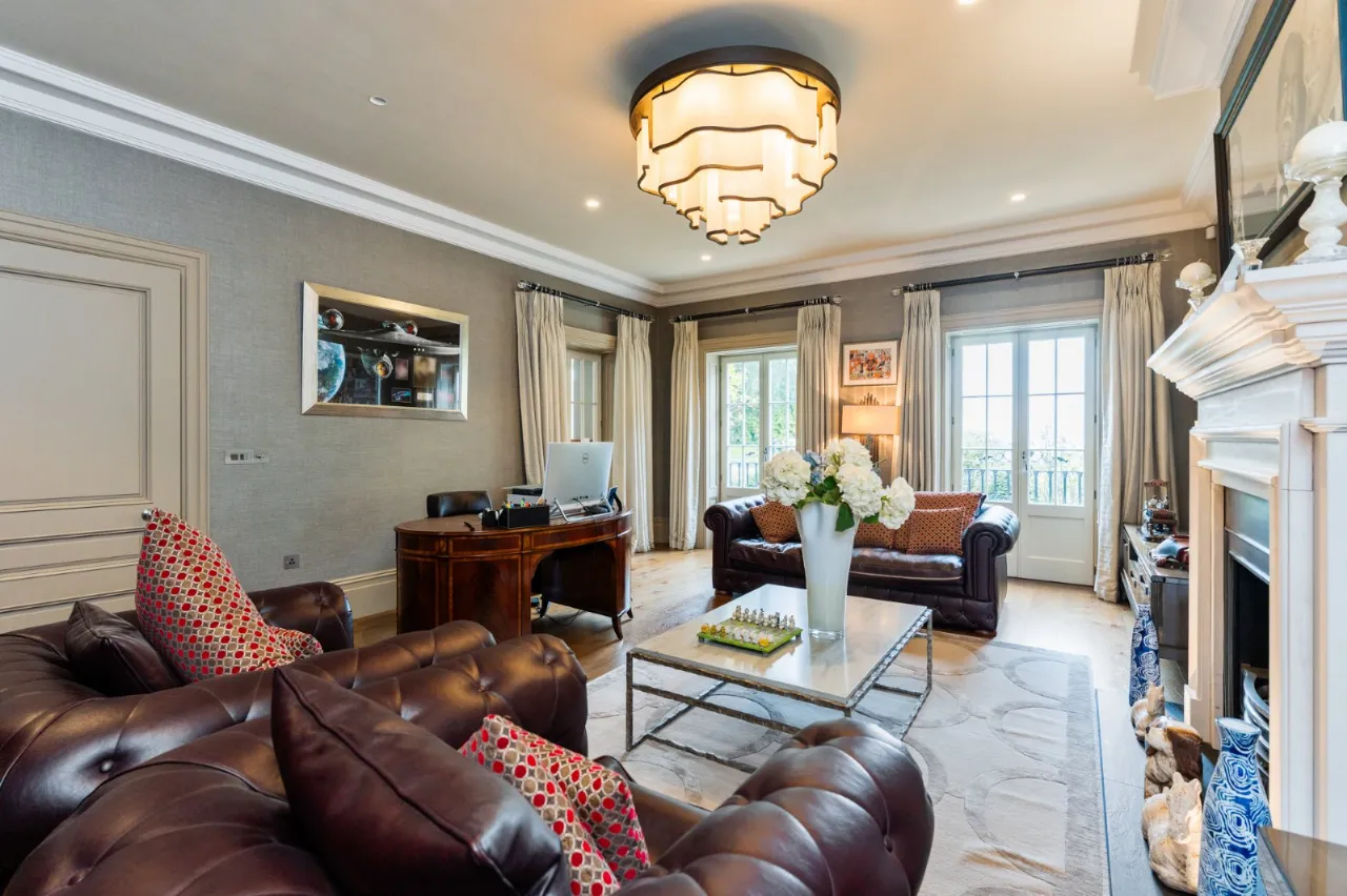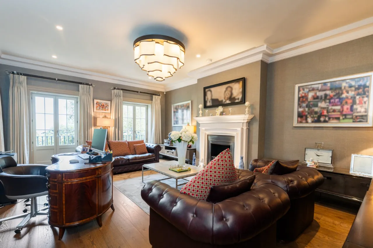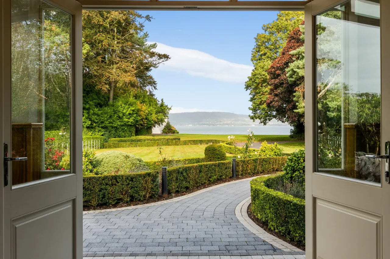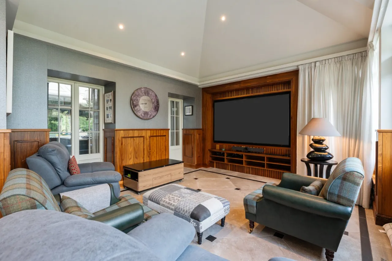 Views over garden to Belfast Lough. Two sets of French doors leading to garden. Vaulted ceiling, tiled floor, walnut panelled walls, media wall, concealed lighting. Access from Kitchen, Hallway and Drawing Room.