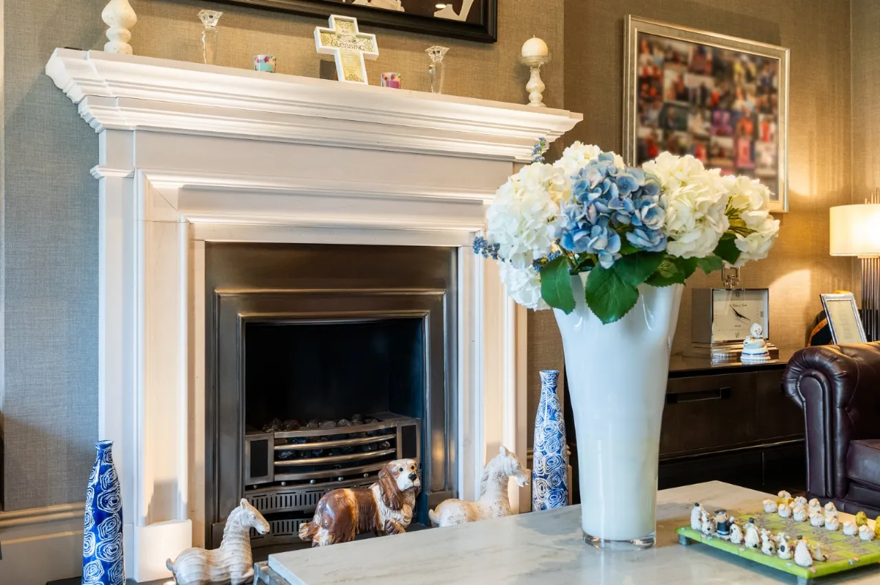 Carved stone fire surround with cast iron inset, gas fire, slate hearth with feature lights, solid wood strip floor, corniced ceiling, recessed lighting, 3 sets of double opening French doors to patio, sea views.