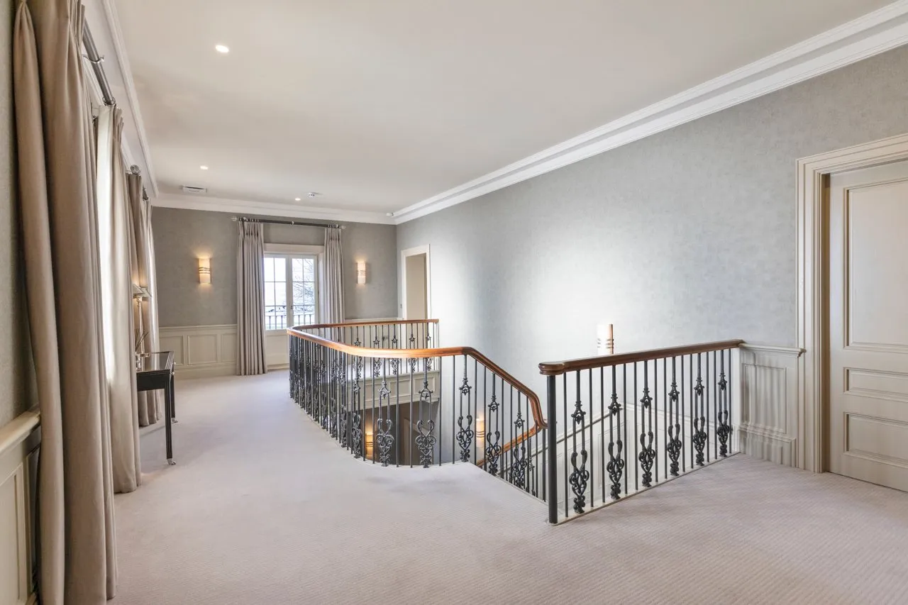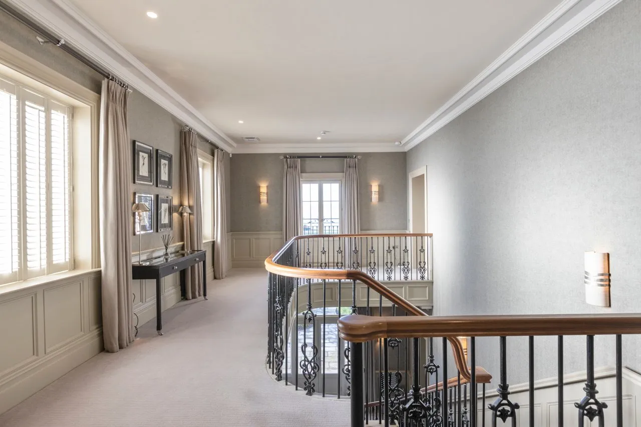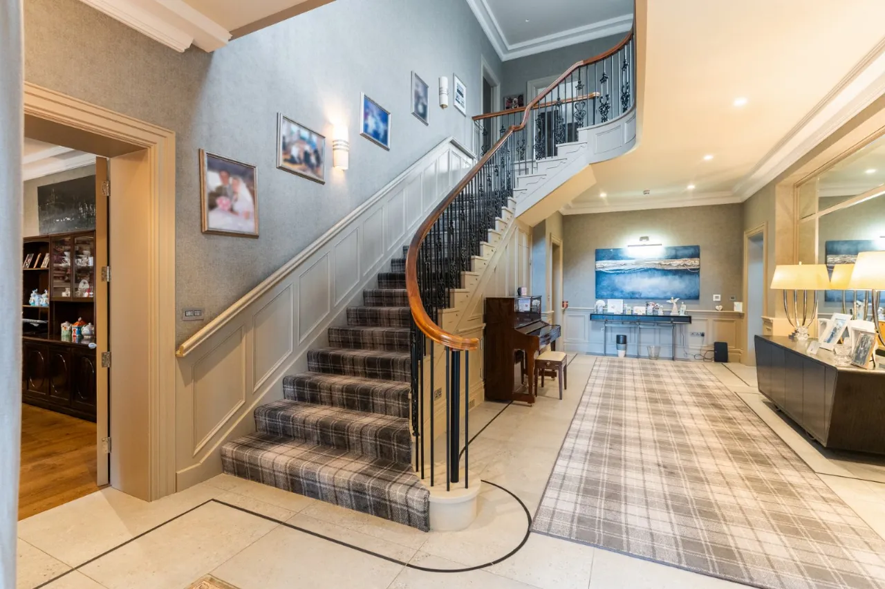 Impressive staircase with wrought iron spindles and polished banister, panelled walls, feature mirror wall, ceramic tiled floor, corniced ceiling, wired for wall lights, recessed lighting.