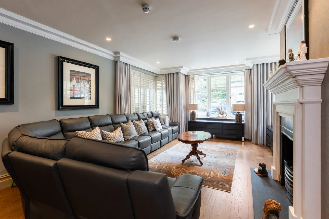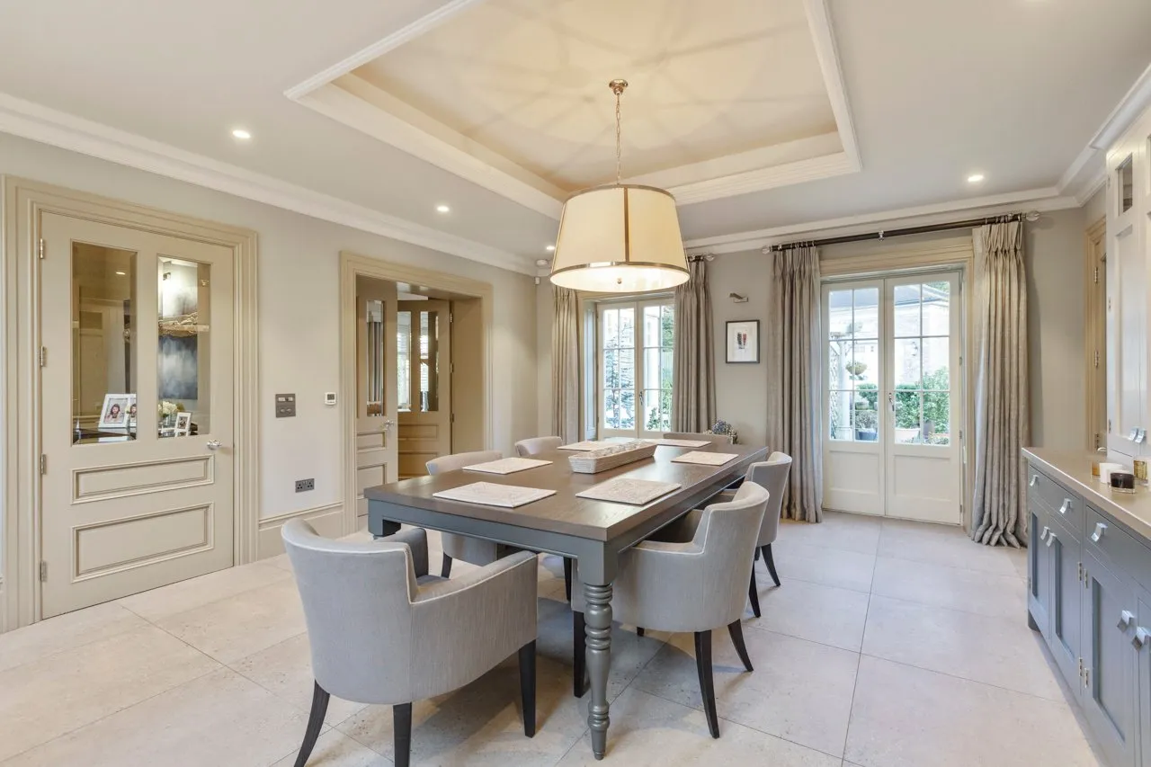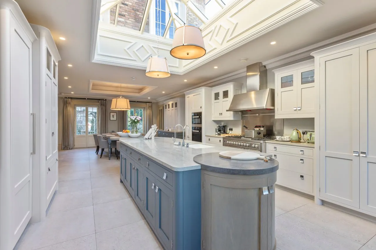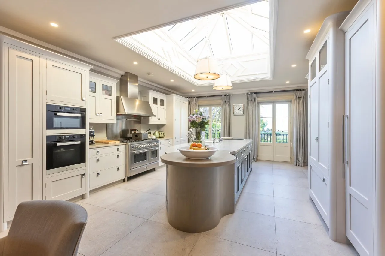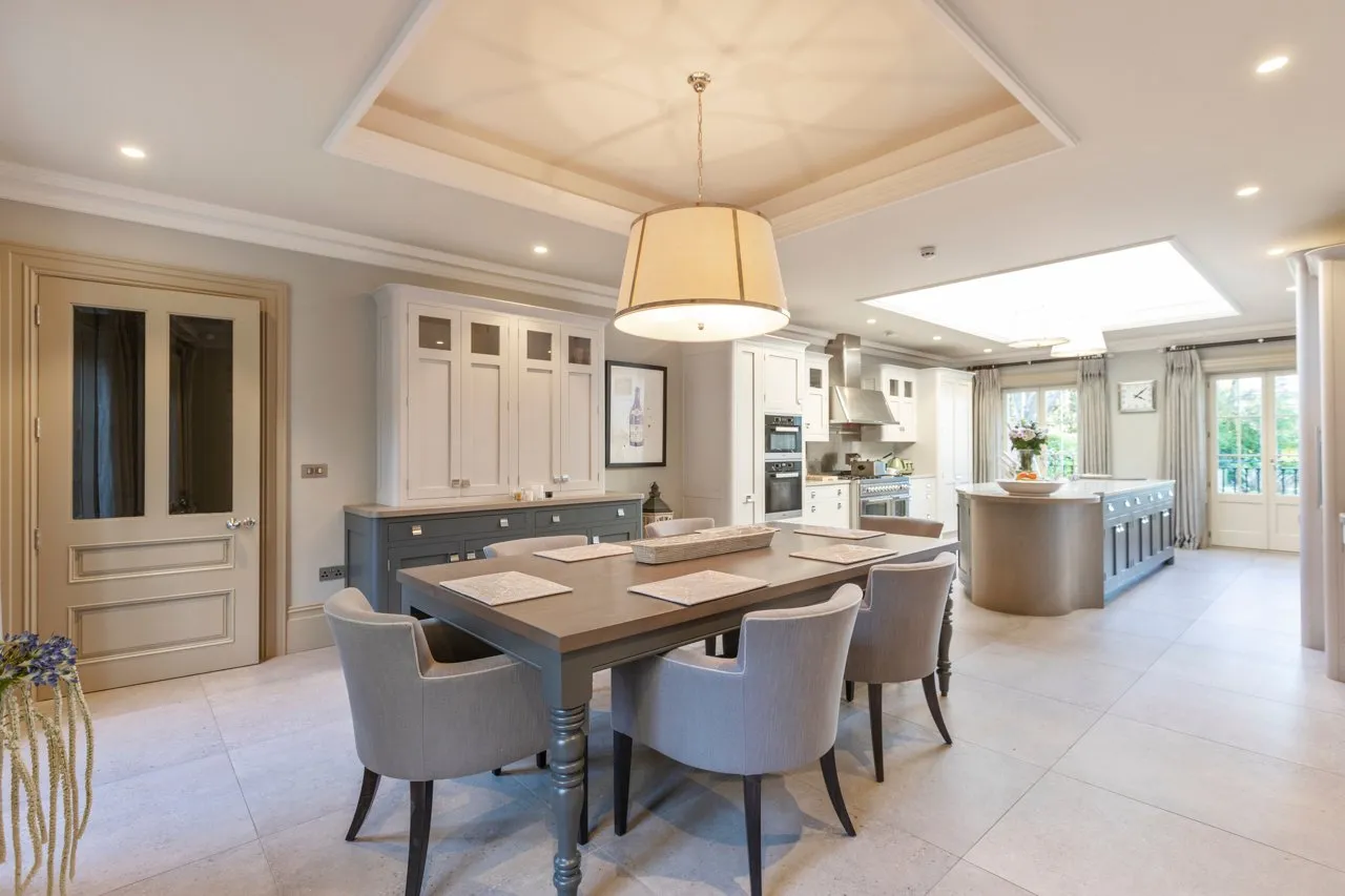 Parkes Interiors bespoke hand painted kitchen, high and low level units, island unit with 1.5 bowl sink with chrome mixer taps and Quooker hot water tap, roof lantern above, 2 integrated Fisher and Paykel drawer dishwashers, space for range cooker with stainless steel extractor hood over, integrated Miele double oven, dresser unit, space for 6-8 seater table, 4 double opening French doors to front and rear patios, corniced ceiling, recessed lighting, wired for wall lighting, ceramic tiled floor, glazed door to Living Room.