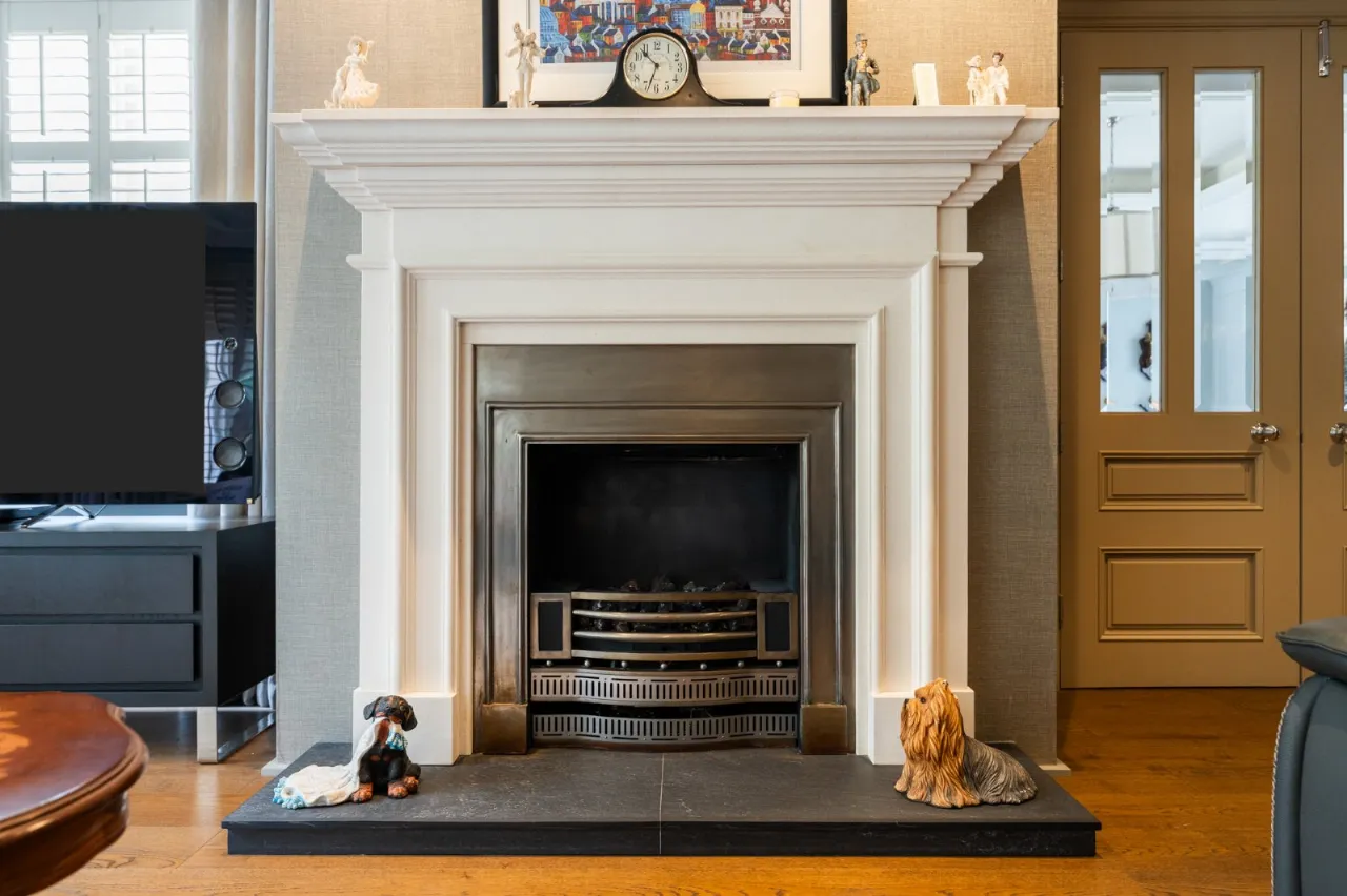 At widest points. Carved stone fire surround with cast iron inset and gas fire, solid wood strip floor, corniced ceiling, recessed lighting, fitted shutters.