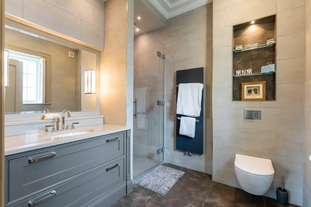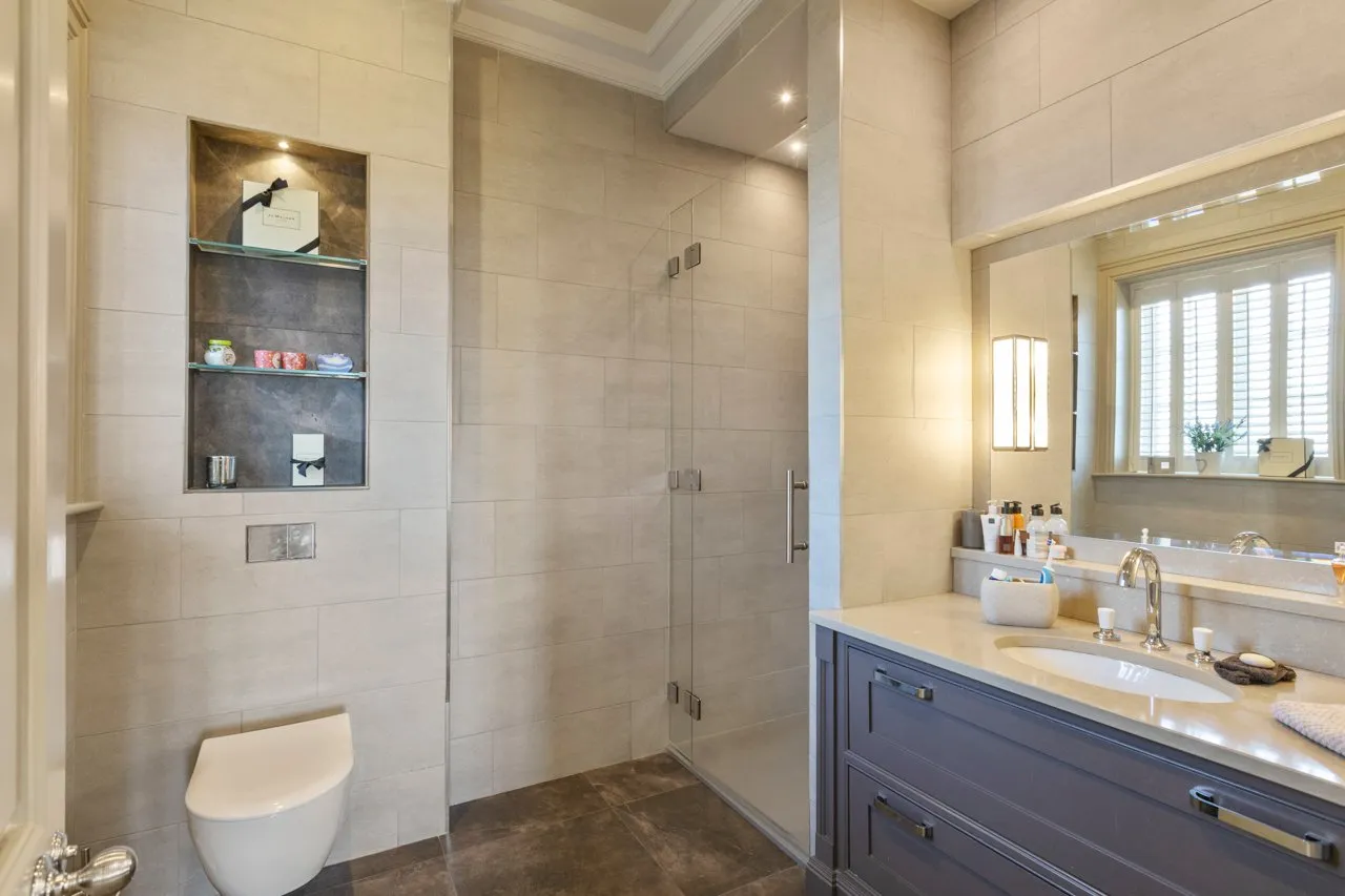 Contemporary white suite comprising of: Low flush WC, inset wash hand basin with vanity unit below with chrome mixer tap, feature mounted mirror with lighting, heated towel rail, fully tiled walls, ceramic tiled floor, corniced ceiling, recessed lighting, fitted shutters.