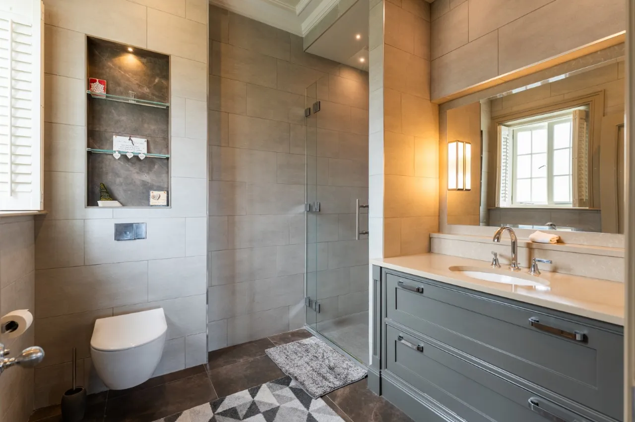 Vanity sink unit with mirror and lights, walk in shower, concealed cistern WC, ceramic tiled floor, heated towel rail, corniced ceiling, recessed lighting, fitted shutters.