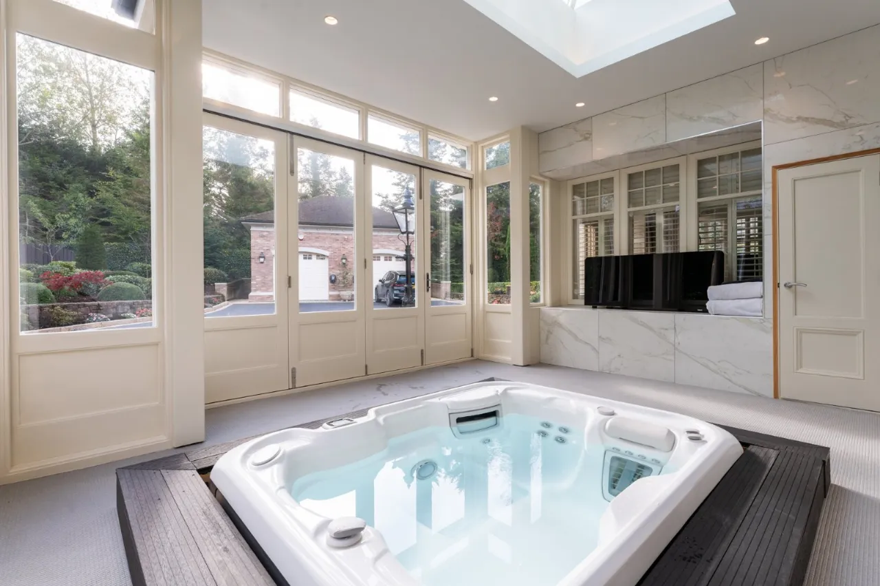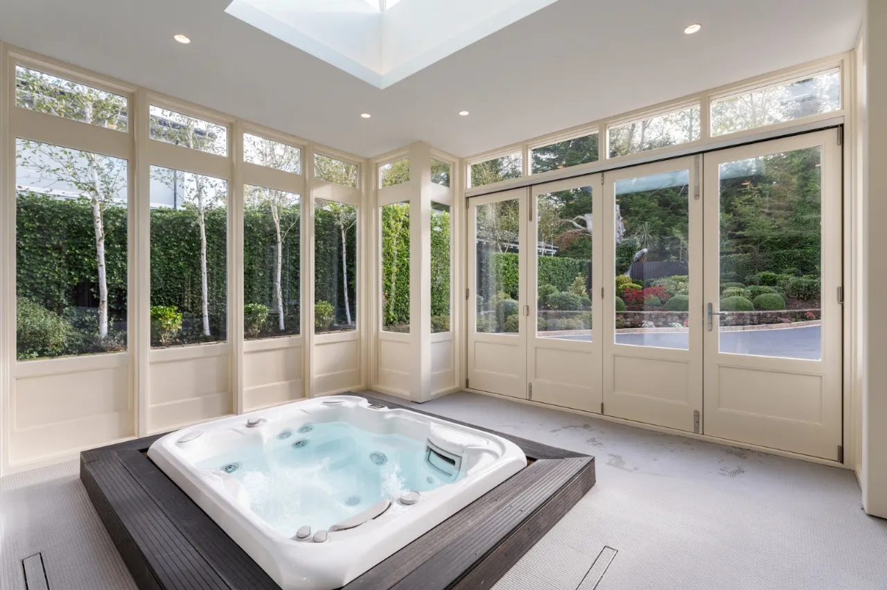 Direct access from Bedroom and Bifold doors leading to courtyard. Roof lantern with concealed lighting. Mosaic tiled floor, tiled walls, sunken hot tub, storage cupboard with water supply.