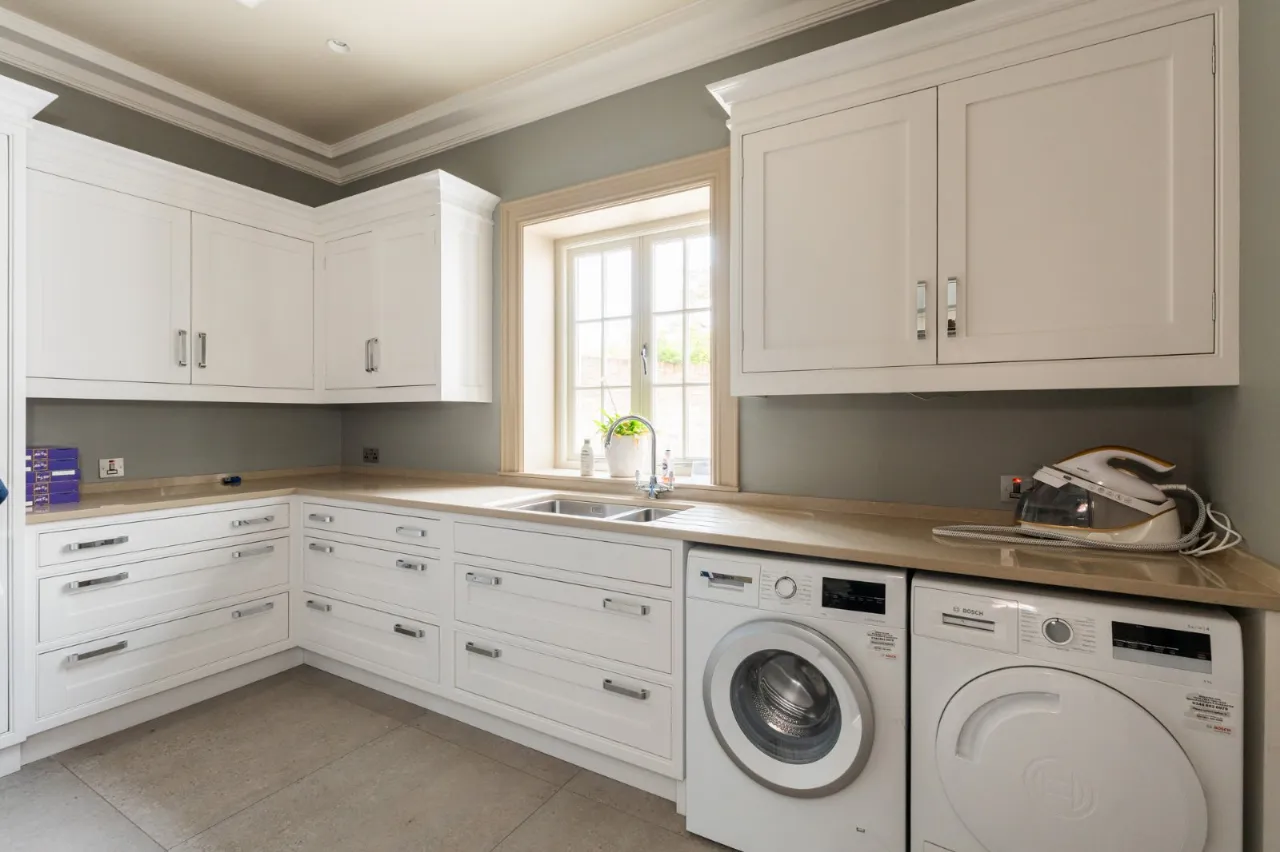 Solid wood hand painted high and low level units, 1.5 tub stainless steel Franke sink unit with chrome mixer tap, stone worktops, plumbed for washing machine, ducted for tumble dryer, ceramic tiled floor, corniced ceiling, recessed lighting, access to roofspace.