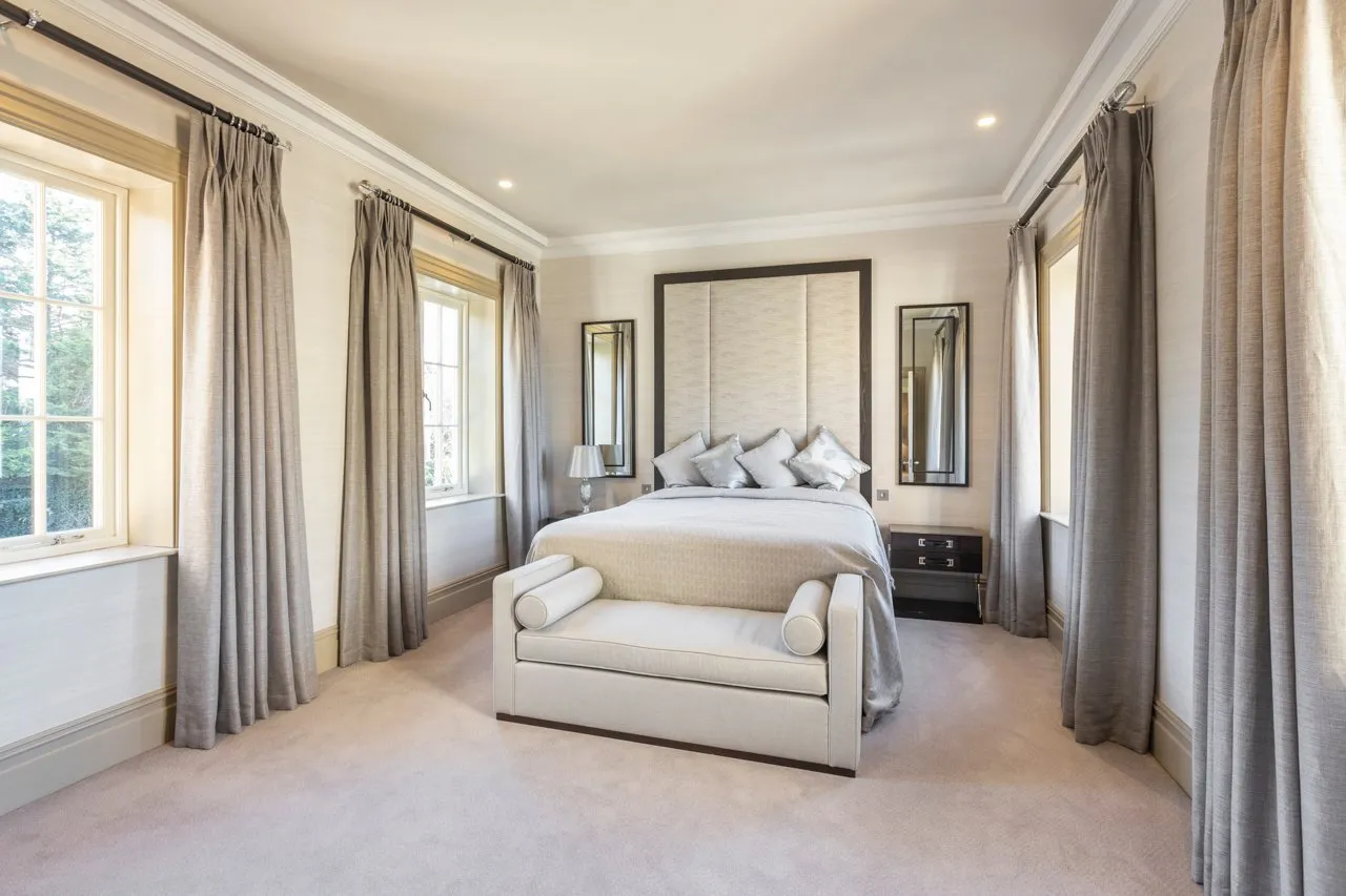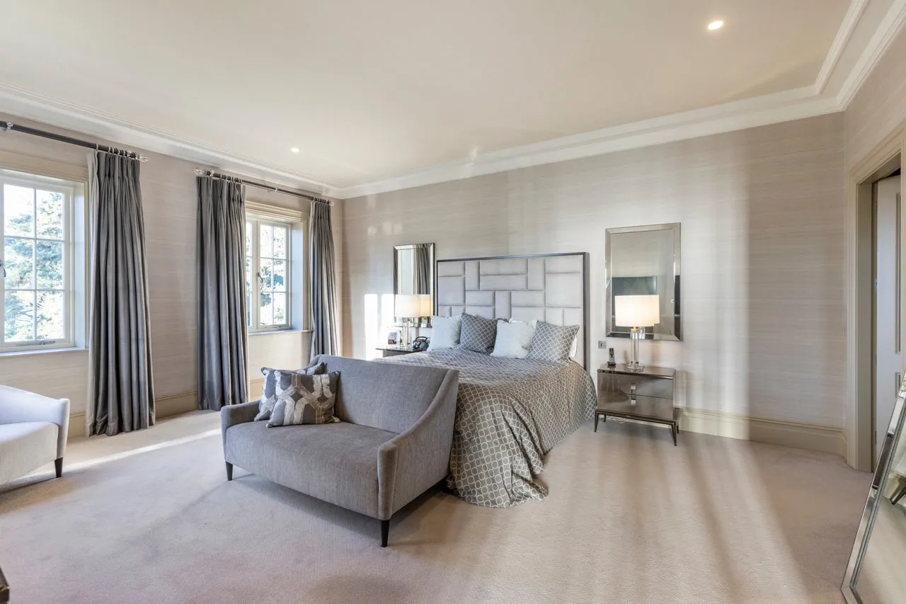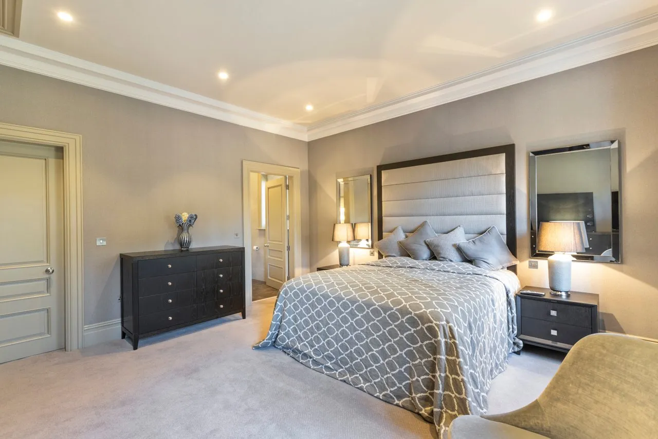 With fitted wardrobes, corniced ceiling, recessed lighting.