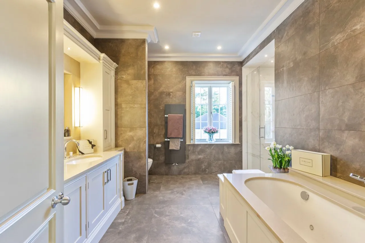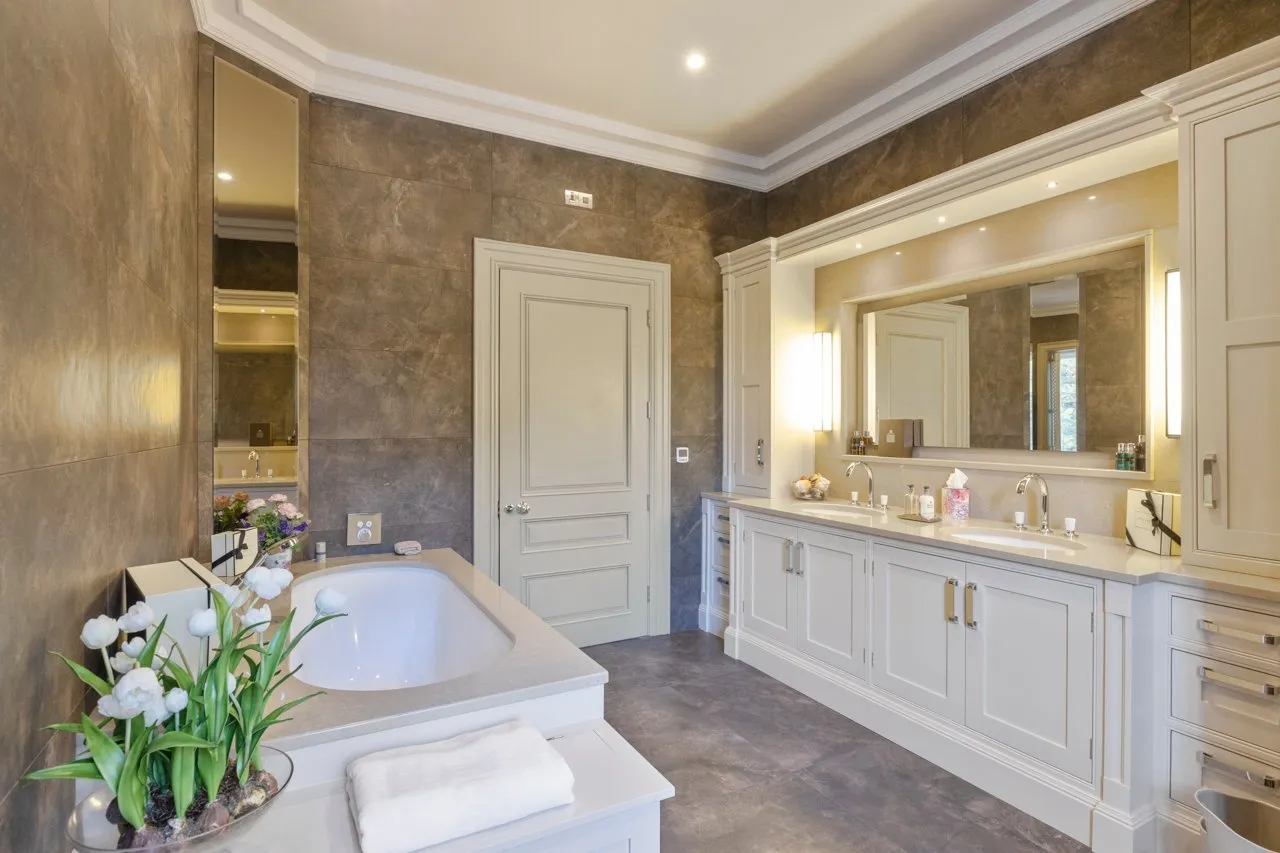 Concealed cistern WC, inset panelled bath with chrome telephone shower attachment, twin inset wash hand basins with vanity below, wall mounted mirror with lights and cupboards each side, walk in double shower with rainfall and telephone shower attachment, corniced ceiling, ceramic tiled floor, heated towel rail, corniced ceiling, fitted shutters.