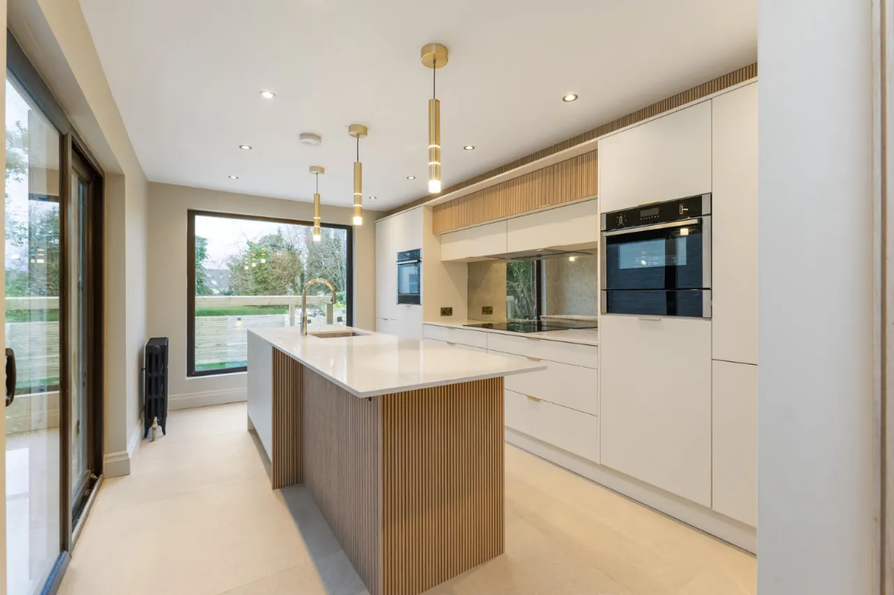 Fantastic range of high and low level units, quartz work surface, 5 ring electric hob, integrated combi grill and microwave, integrated oven, integrated fridge and freezer, larder cupboard with brand new gas boiler, plumbed for washing machine, space for tumble dryer, island unit with quartz work surface, stainless steel sink unit with Quooker tap, integrated dishwasher, ample storage, casual dining, tiled flooring, recessed spotlighting, sliding doors leading to rear garden