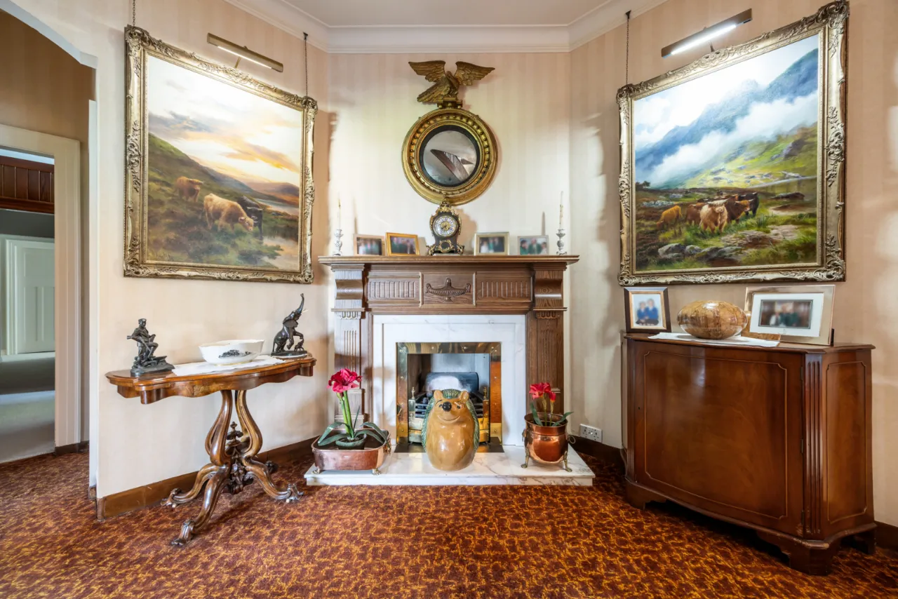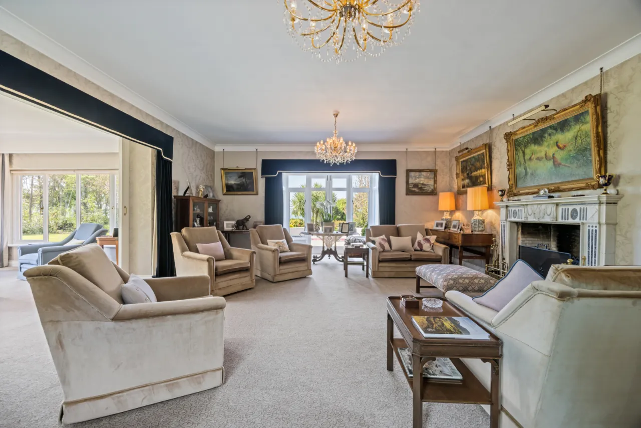 Views over garden to Belfast Lough, corniced ceiling, marble fireplace with slate inset and hearth, dog grate with gas fire (currently disconnected). Seats 14/16 people.