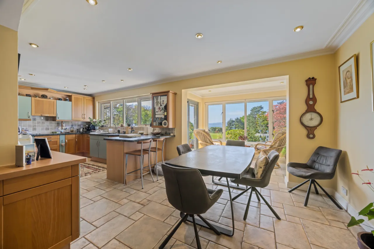 Ceramic tiled floor. Views to garden and Belfast Lough. Corniced ceiling. Recessed lighting. Sliding double glazed door to patio.