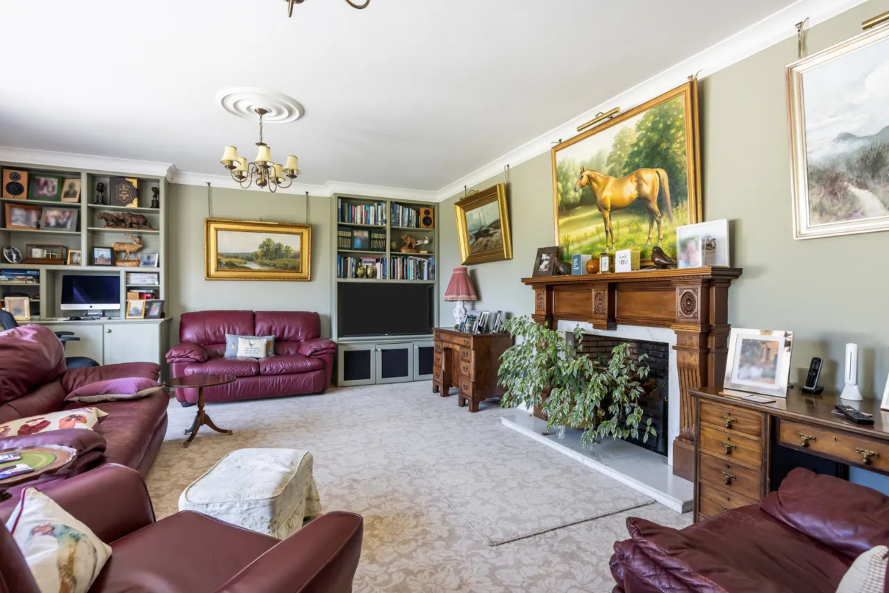Bay window with window seat. Oak panelled walls. Fitted book shelves. Oak fireplace with marble inset and hearth. Corniced ceiling. Recessed lighting.