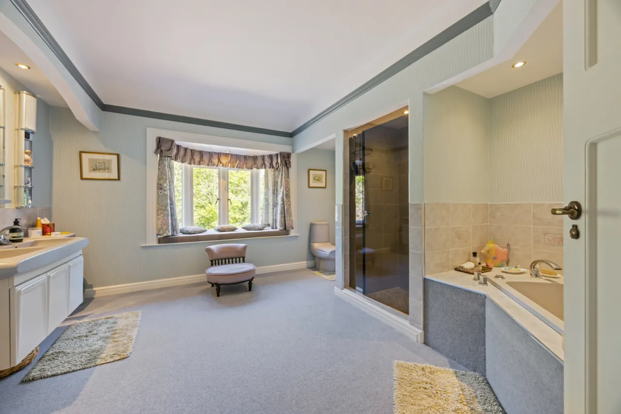 Coloured suite comprising: Jacuzzi bath. Fully tiled shower cubicle. Twin vanity unit with cupboards below. Low flush WC. Oriel bay window with seating. Partly tiled walls. Heated towel radiator.