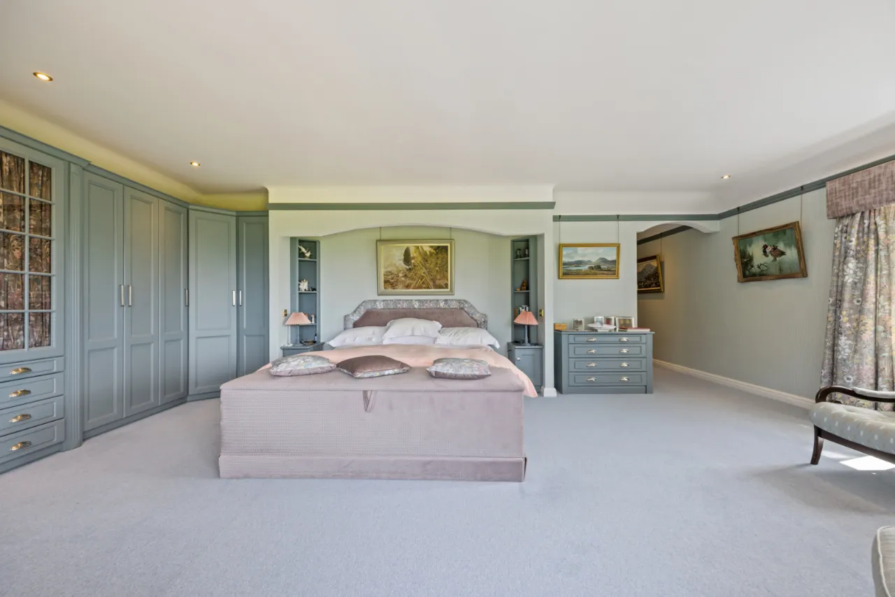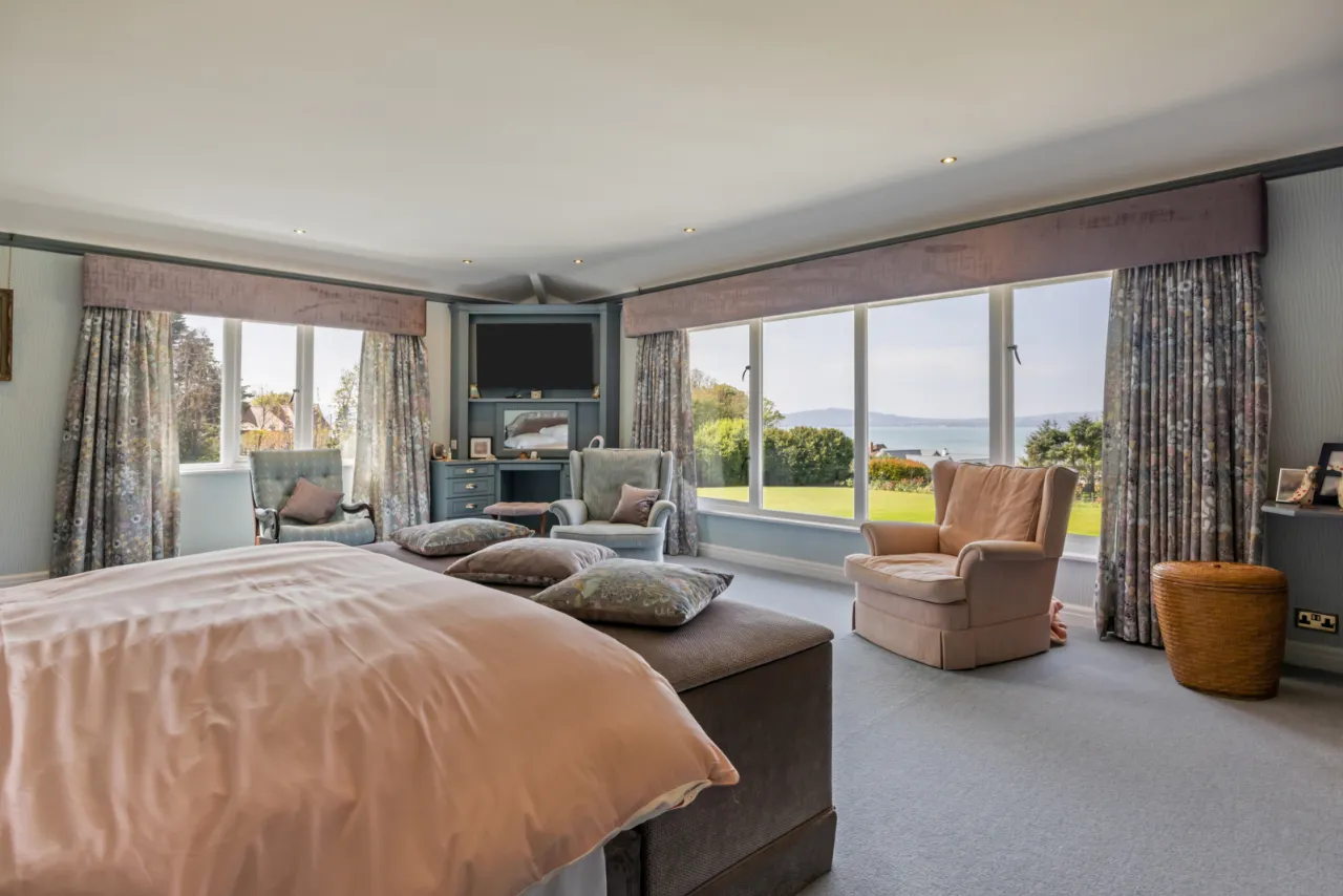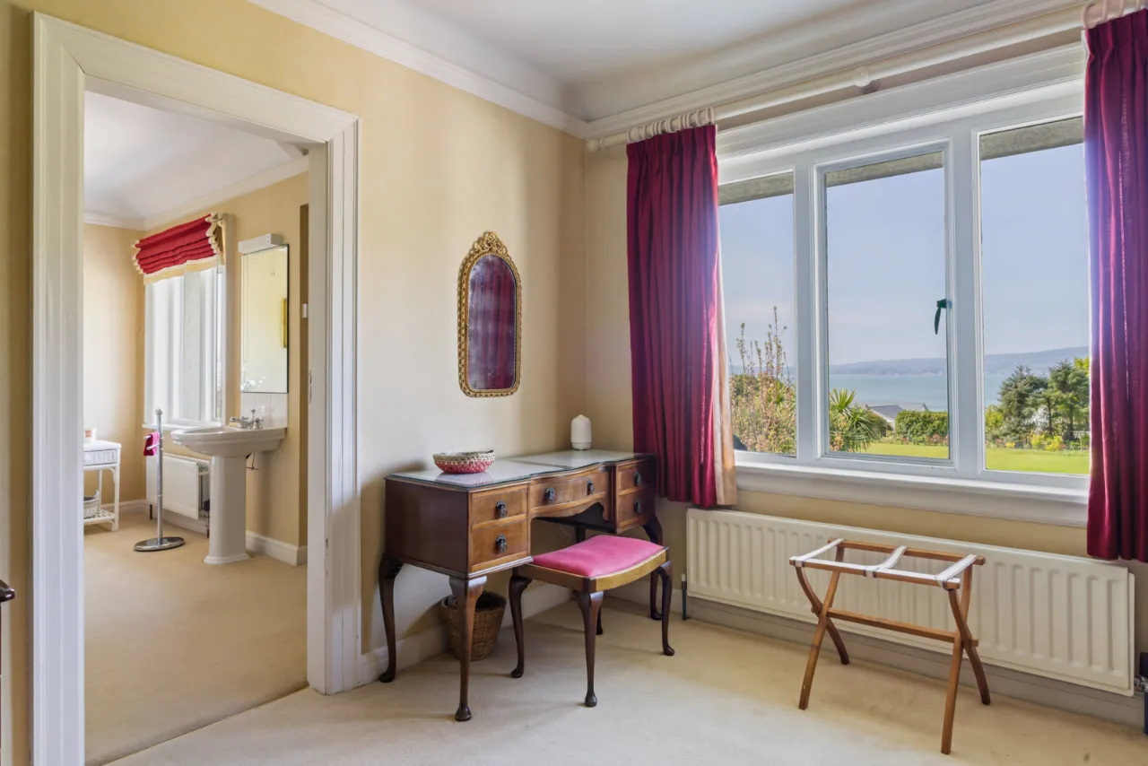 Views over garden to Belfast Lough. Excellent range of built in wardrobes. Recess for bed and bedside units. Built in dressing table and chest of drawers. Recessed lighting.